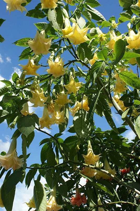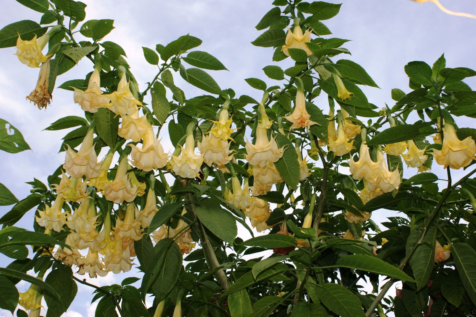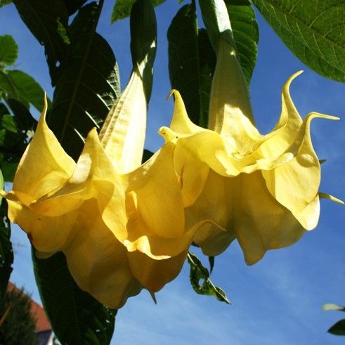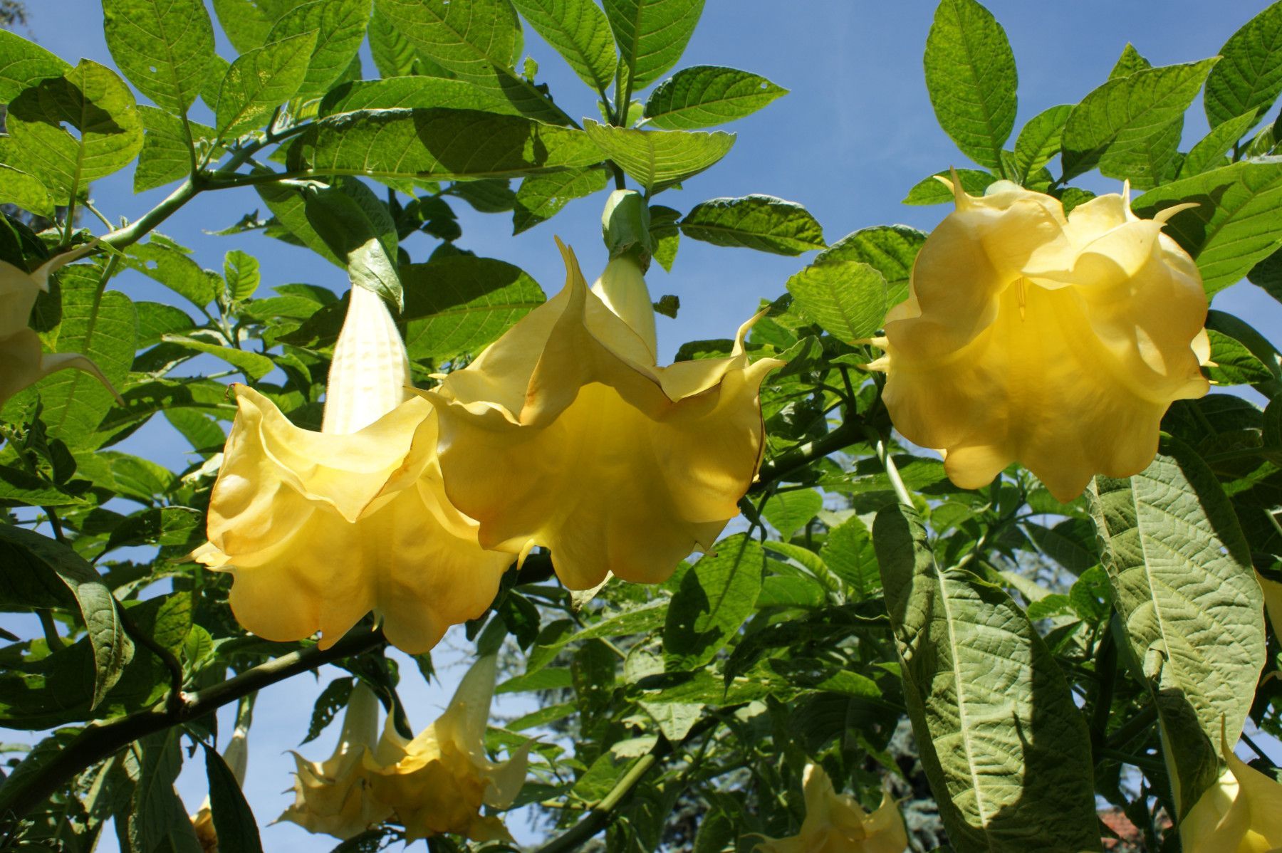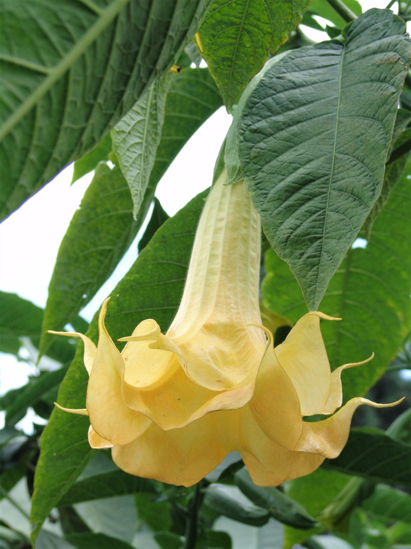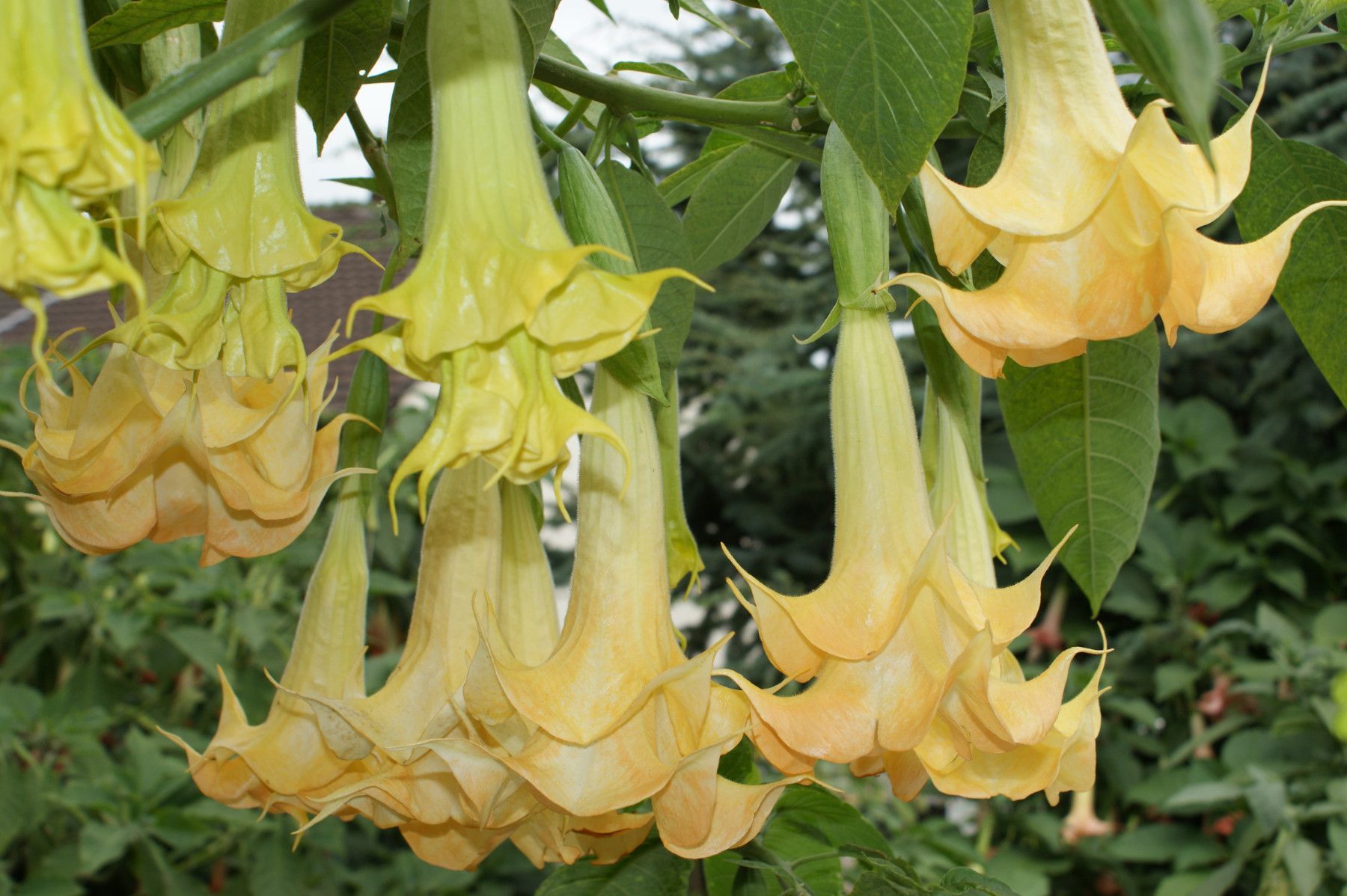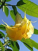 Engelstrompete "Angels Swingtime" mit locker gefüllten, gelbfarbigen Blüten (Datura)
