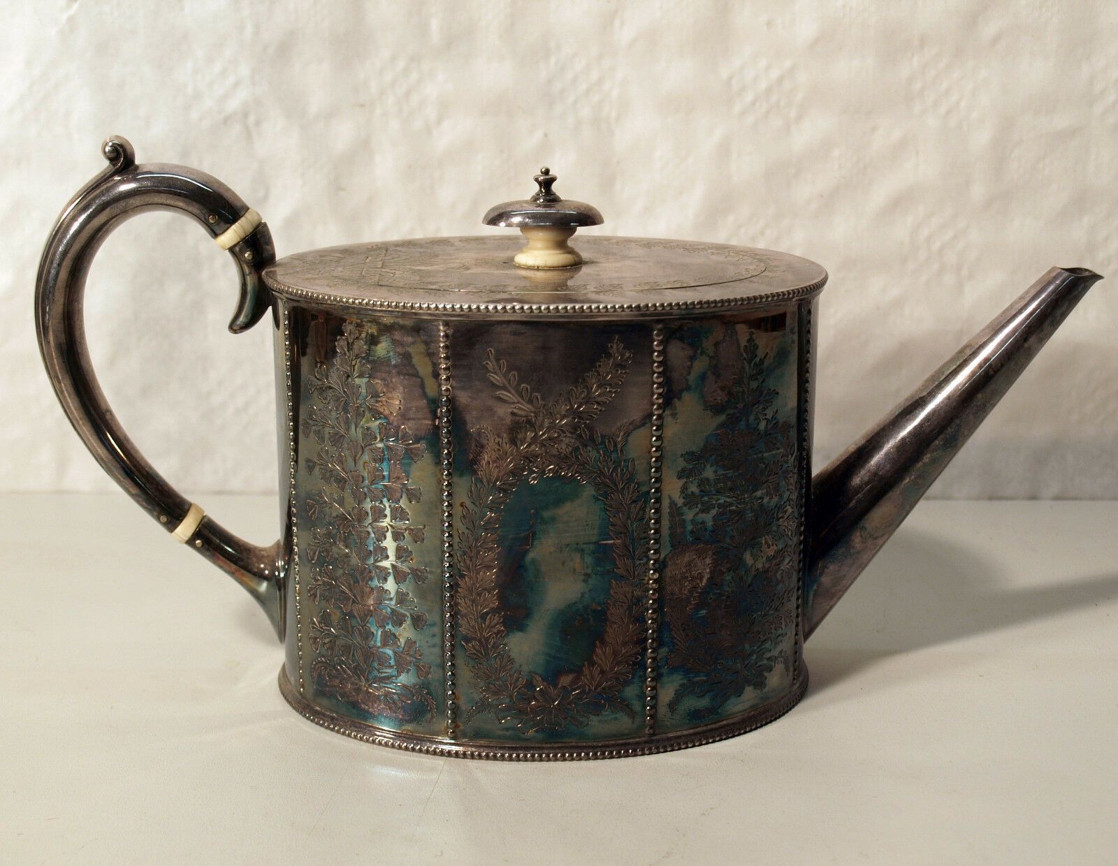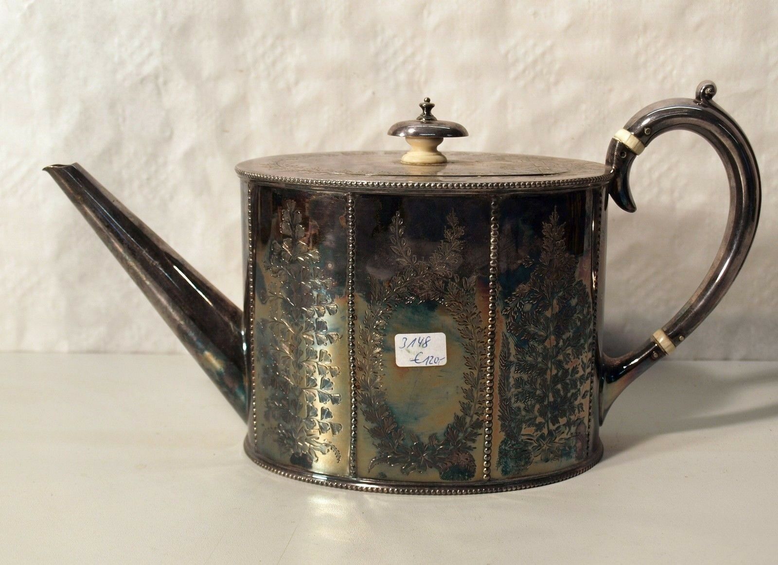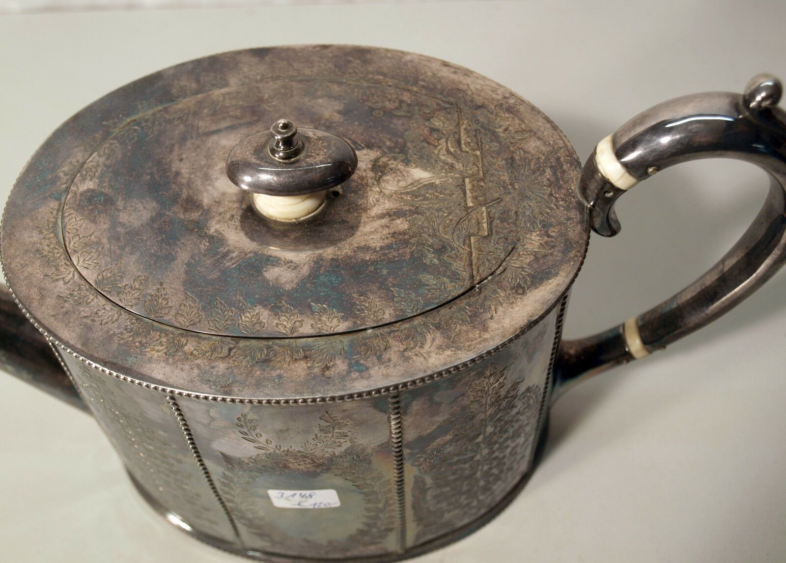 Englische Teekanne um 1920. Ohne Marke. Silver plated. Sehr gut erhalten, aber ungeputzt. Maße: L 28, H 15 cm. Antikes am Deich - Inh: Oliver Kipp-Trense G M T Sprache erkennen Afrikaans Albanisch Arabisch Armenisch Aserbaidschanisch Baskisch Bengalisch Bosnisch Bulgarisch Burmesisch Cebuano Chichew
