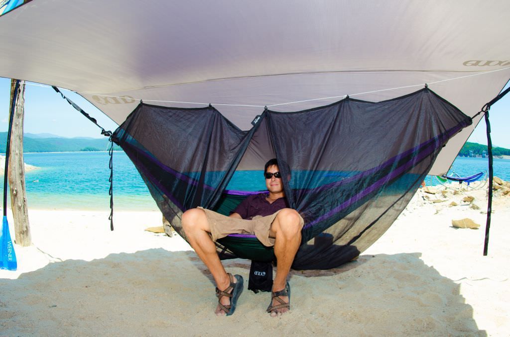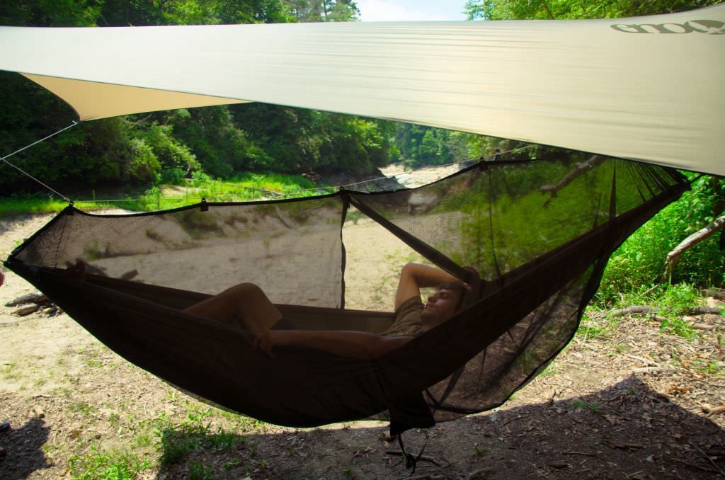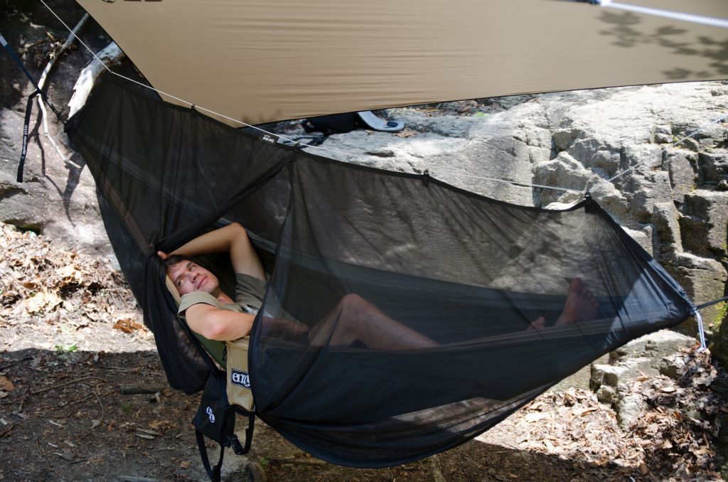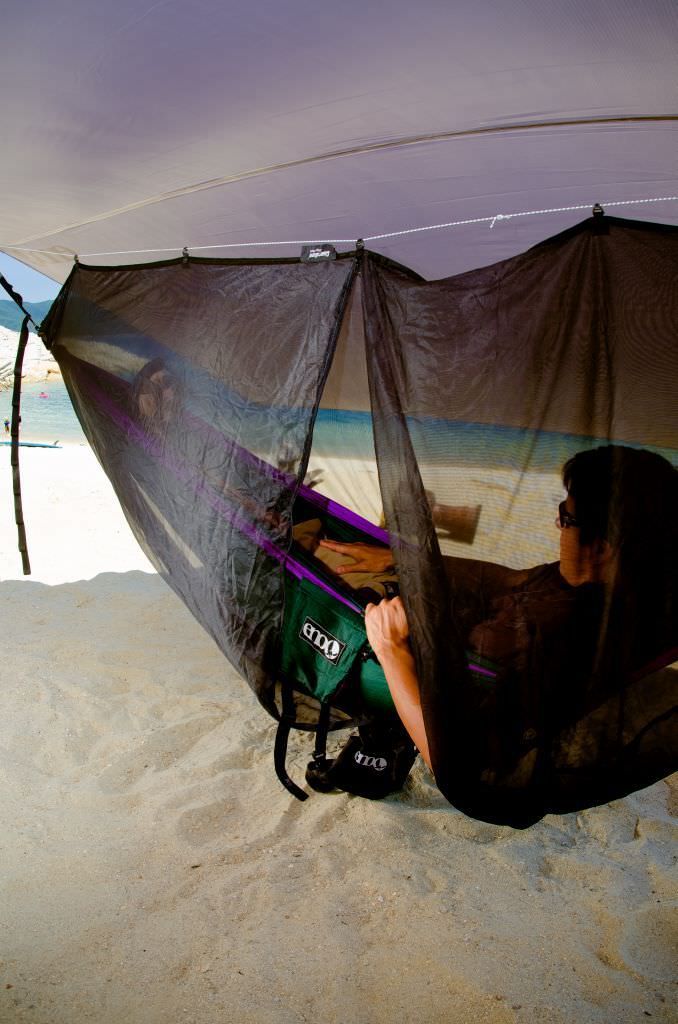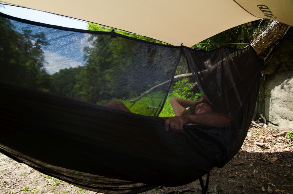 <p>Das eno guardian bugnet Moskitonetz ist schwarz und bietet so eine gute Durchsicht nach aussen und gleichzeitig einen effektiven Blickschutz, um die Privatsphäre zu wahren. Das große, engmaschige Netz wird wie ein Schlauch über die Hängematte gezogen und an 5 Montageschlaufen an einer gespann