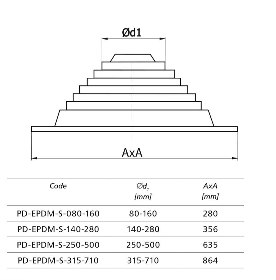 PD-EPDM-S Dachdurchführung ist zum Abdichten von Dachdurchführungen bestimmt. Das Produkt wurde aus EPDM-Gummi mit einer hohen Temperaturbeständigkeit, UV-Strahlungs- und Streckfestigkeit hergestellt. Es passt sich an die Rohre und Austritte mit verschiedenen Durchmessern sehr einfach an. Die Außens