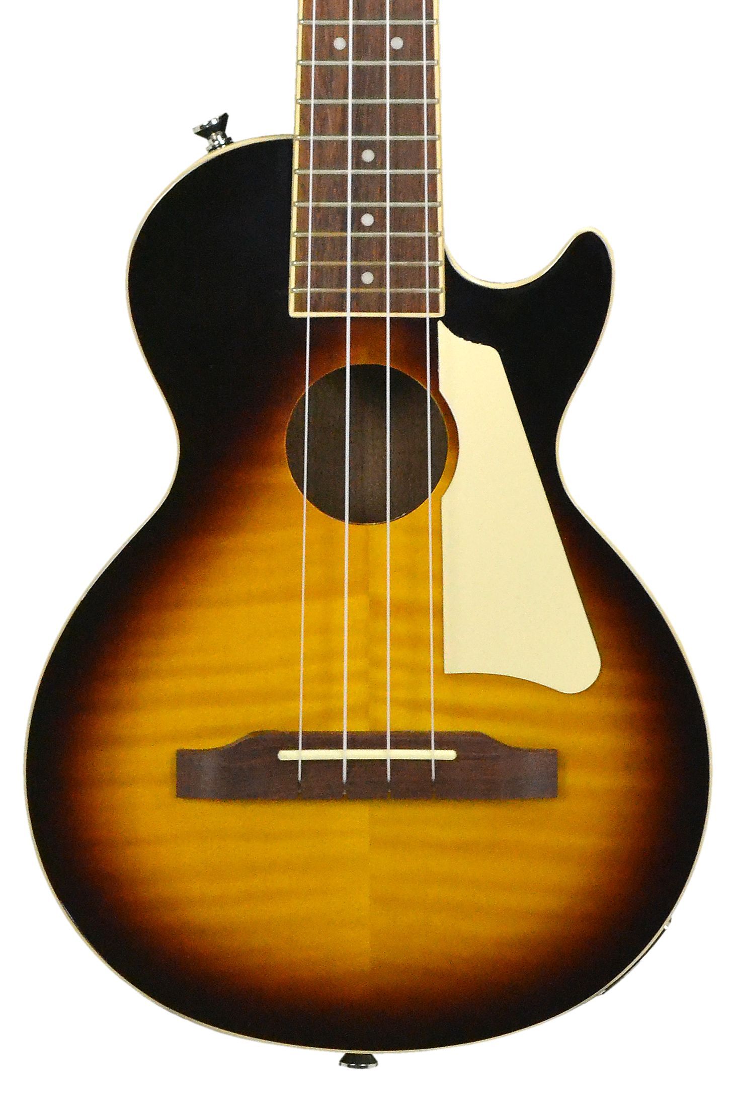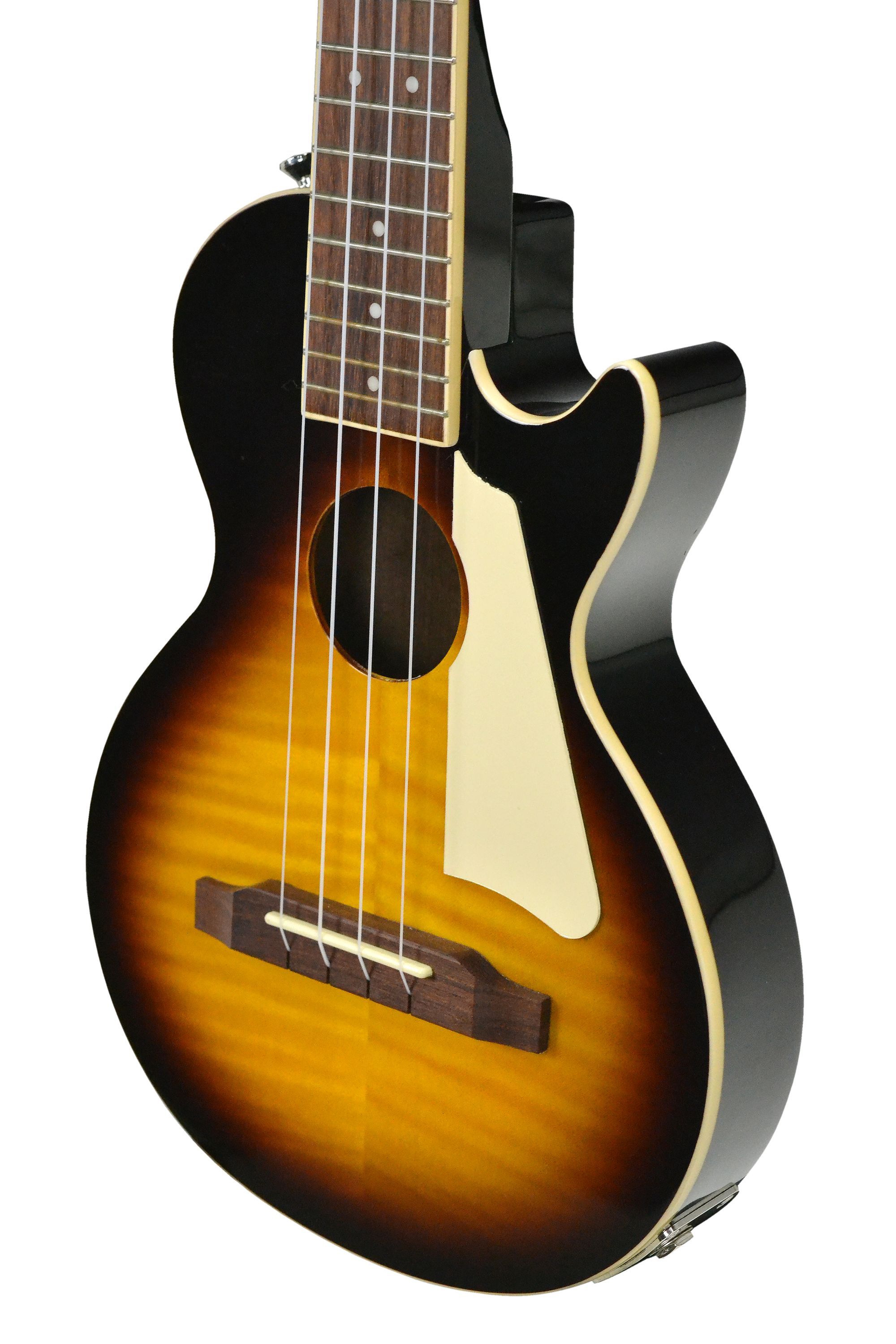 Epiphone Les Paul Tenor Ukulele Vintage Sunburst Tenor Ukulele mit Cutaway mit Tonabnehmersystem Decke: AAA Riegelahorn Boden und Zargen: Mahagoni Hals: Mahagoni Griffbrett: Granadillo Mensur: 43,18 cm Sattelbreite: 35 mm 19 Medium Bünde Sattel: U-Rite Mechaniken: Premium Open Back, Übersetzung 14:1