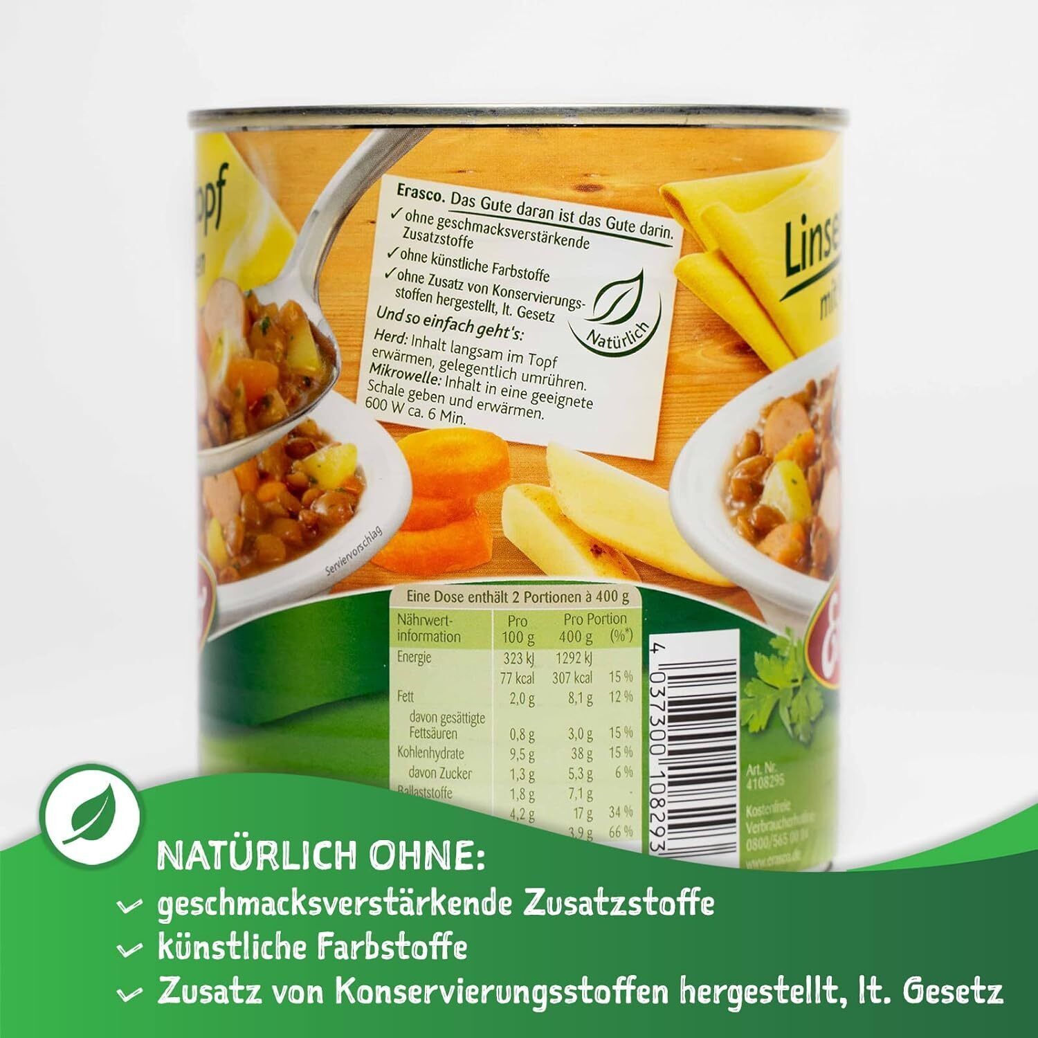 Erasco Linsen-Eintopf mit Wérstchen Viel Gemése Fertigmahlzeit Mikrowelle 800g