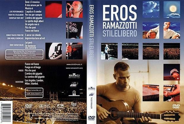 Eros Ramazzotti - Stilelibero BMG Italy 74321904429 2001 60 min., Dolby Digital 5.1 & 2.0 Subtitle Language: English, German, Italian, Spanish 1- Dove c'è musica 2- Il mio amore per te 3- Musica è 4- L'aquila e il condor 5- Per me per sempre 6- L'ombra del gigante 7- Lo spirito deg