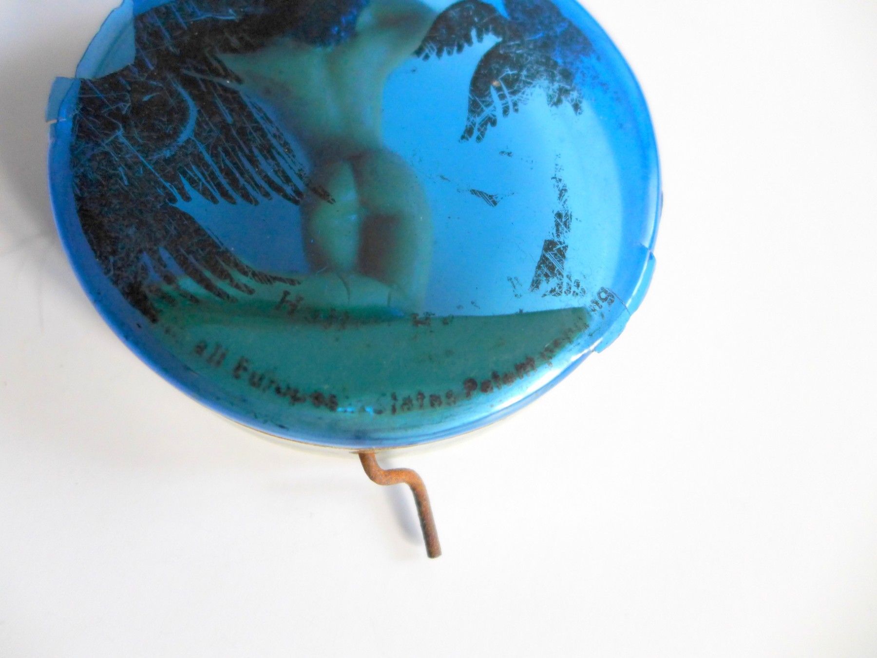 gebrauchter Zustand siehe Fotos , bespielt , durch drehen der Kurbel bewegt sich die Figur bauchtanzartig ab den Knien aufwärts Unterteil der Dose beschädigt mit Fehlstellen und Farbverlust ( Aufdruck , Beschriftung ) , Durchmesser der Dose ca. 65 mm , Lichtspiegelungen , Schattenbildung , Farbabwei
