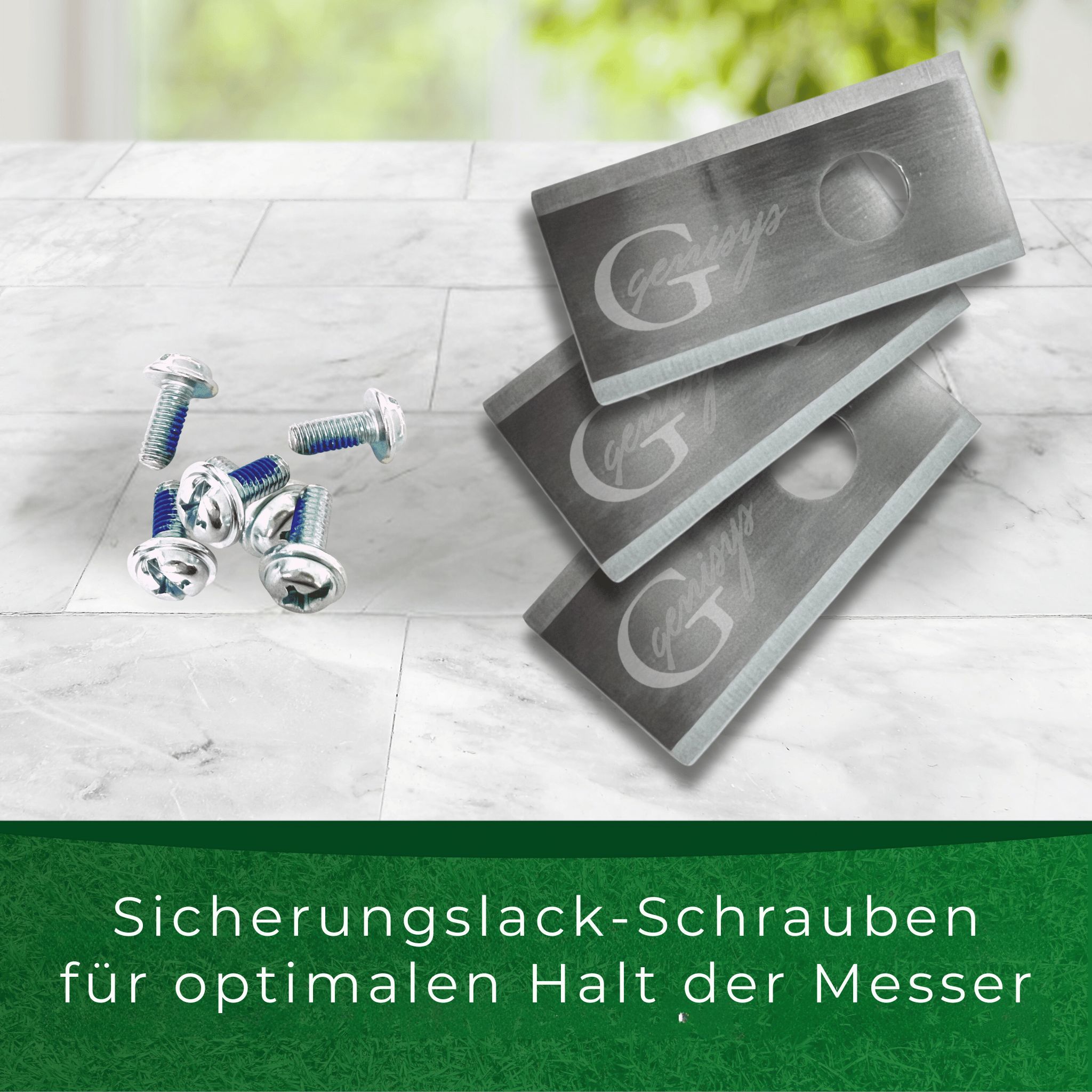 Extra gehärtete Messer von Genisys mit Sicherungslack - Schrauben. Bruchsicher durch die Umstellung auf auf die 1-Loch Variante Beste Haltbarkeit : aus rostfreien Edelstahl (Stärke 0,9mm ) - ohne die Starrheit und somit ein mögliches Brechen zu erhöhen Höchste Sicherheit : Unsere Messer sind die ein