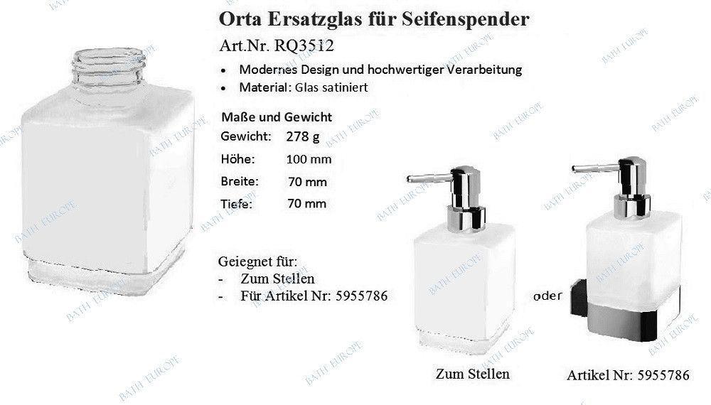 Ersatzglas (ohne Pumpe!) für Seifenspender ORTA. Quadratisches Design. Massiv