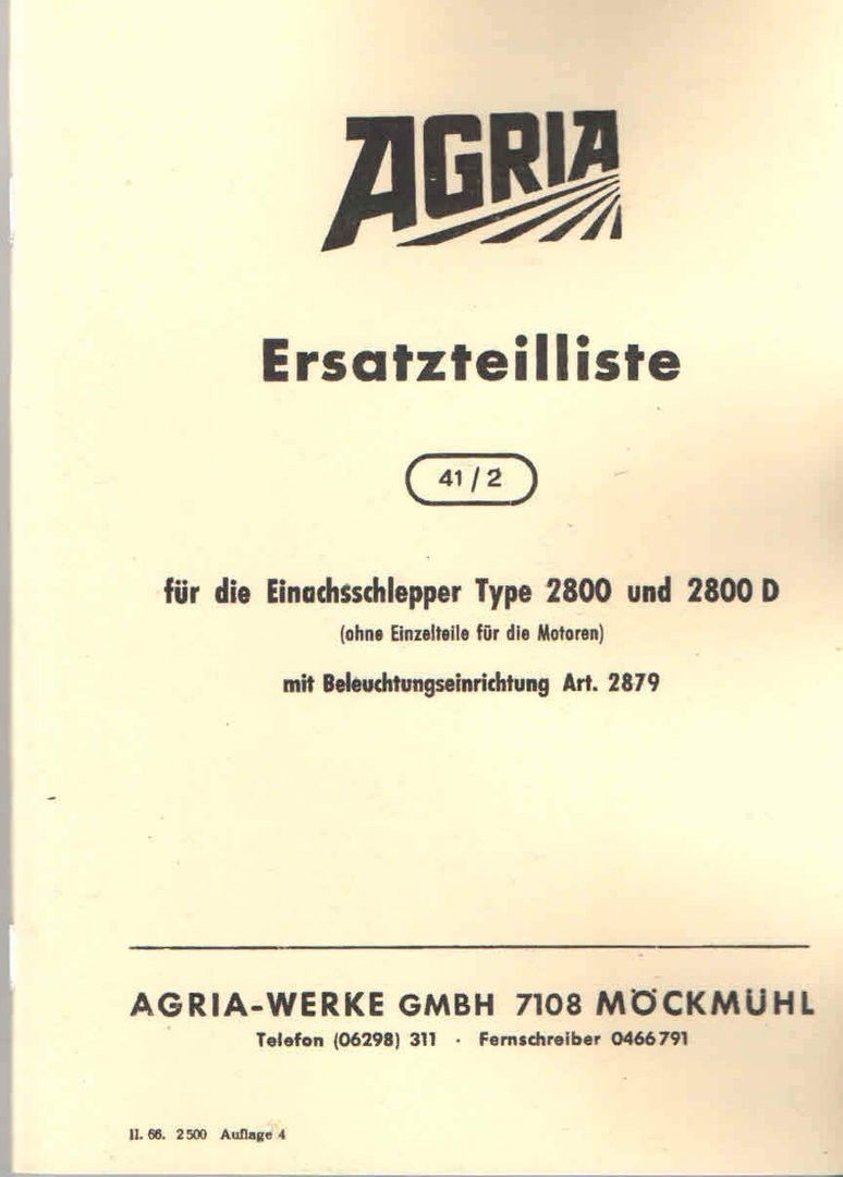 Ersatzteilliste Agria Einachsschlepper Type 2800 und 2800D, Landtechnik, Oldtimer