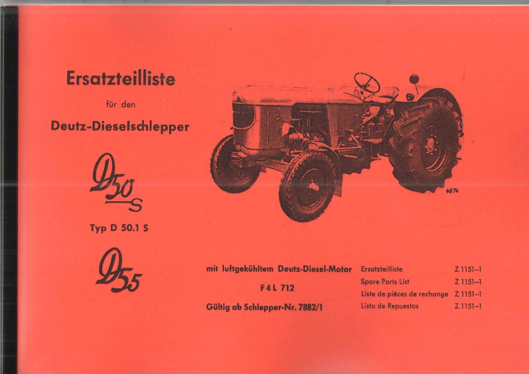 Ersatzteilliste Deutz Dieselschlepper D 50 S D 55 mit luftgekühltem Deutz Dieslemotor F 4 L 712 gültig ab Schlepper Nummer 7882 1 in Deutsch, Englisch, Französisch, Spanisch ca 192 Seiten A 5 Nachdruck