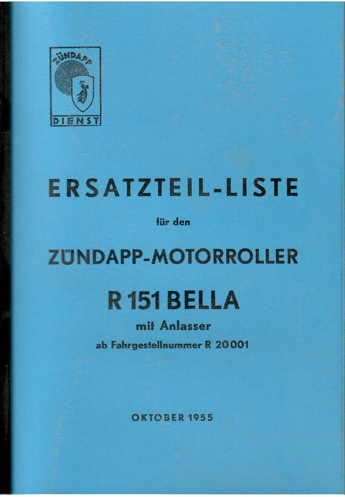 Ersatzteilliste für Zündapp Motorroller R 151 Bella mit Anlasser ab Fahrgestellnummer R 20001 Kurzbeschreibungen und Zeichnungen sämtlicher Einzelteile Ausgabe Oktober 1955 ca 87 Seiten A 5 Nachdruck
