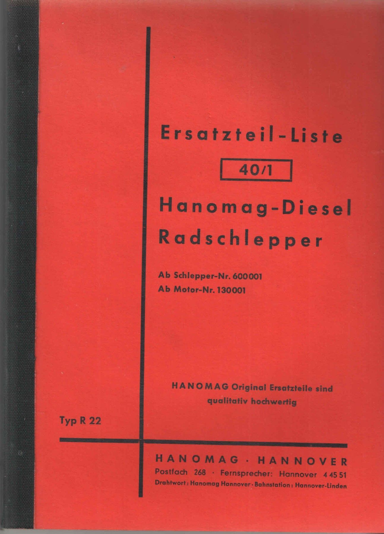 Ersatzteilliste Hanomag Diesel Radschlepper Typ R 22 Ab Schlepper Nr. 600001 Ab Motor Nr. 130001 Ersatzteil-Liste Nr. 40 1 Ausgabe August 1951 ca 250 Seiten A 5 Nachdruck