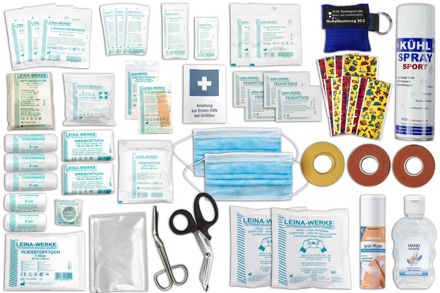 + inkl. Erste-Hilfe-Ausstattung nach aktueller DIN 13157 + Hygiene-Gel + 2x Sporttape + NEU: 1x Fingertape + 2x Sofort-Kälte-Kompresse + 300ml Kühlspray + Notfallbeatmungshilfe + NEU - Kinderpflasterset + NEU - Sprühpflaster + u.v.m.