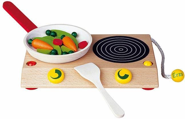 Erzi Erzi Kochstudio * Tisch-Spielherd mit Pfanne + Gemüse Kinder-Herd aus Holz 10690