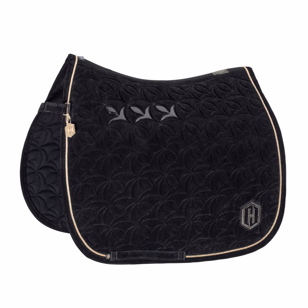 neues robustes Velours-Obermaterial und Cool-Dry Unterseite elegante Steppung mit mitteldicker Füllung Anti-Slip Silikonflächen im Sattelbereich Lurex-Kordel auf Velour-Einfassung Mesh-Rückenkanal für optimale Luftzirkulation Gurtschlaufe mit dreifacher Fixierungsoption für exakte Positionierung Inn