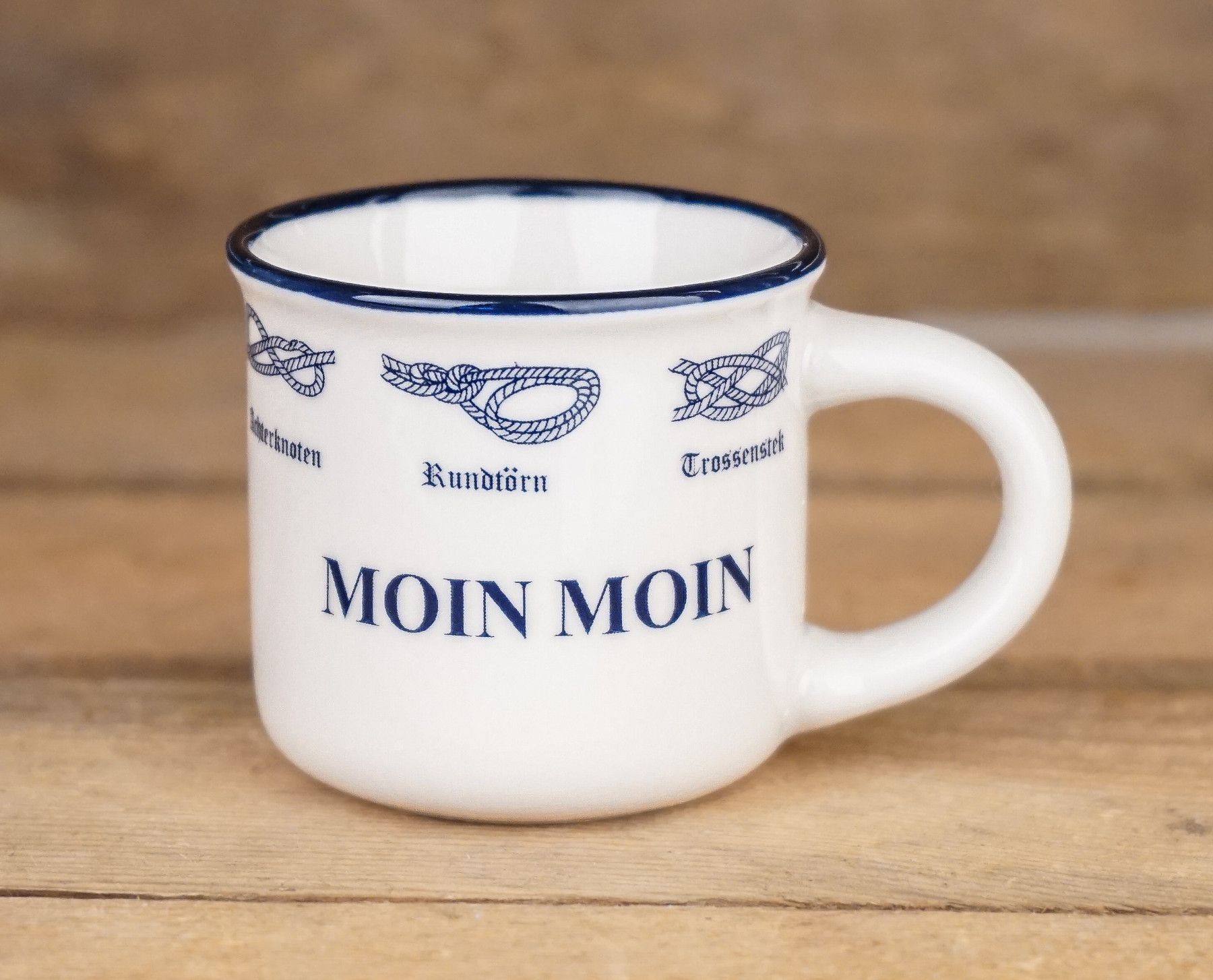 Moin Moin Espresso – Seemannsknoten-Design mit blauem Rand Starten Sie Ihren Tag mit maritimem Flair und einem Hauch von Seefahrer-Romantik! Unser Moin Moin Becher ist perfekt für alle, die das Meer lieben und sich von der Küstenatmosphäre inspirieren lassen möchten. Produktdetails: Design : V