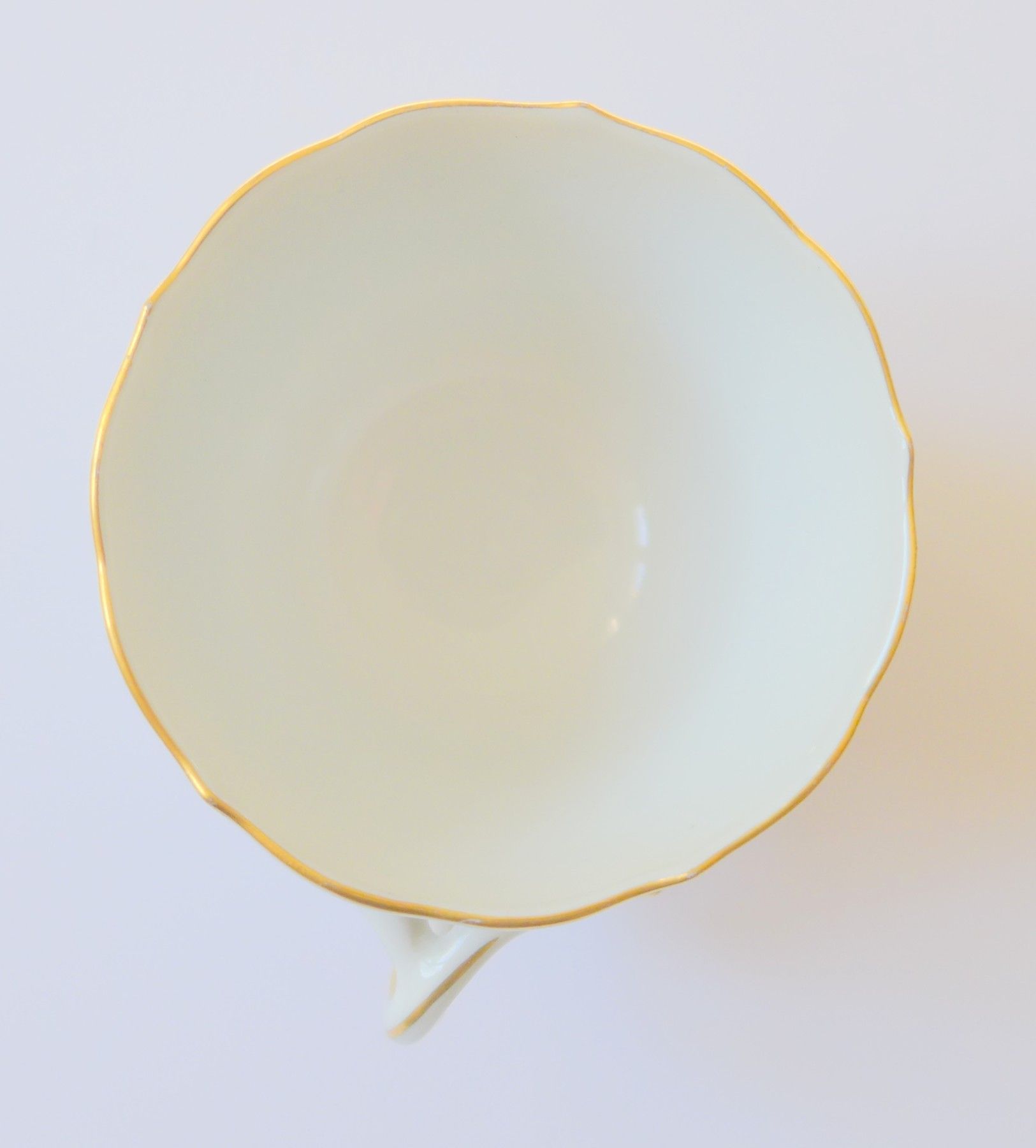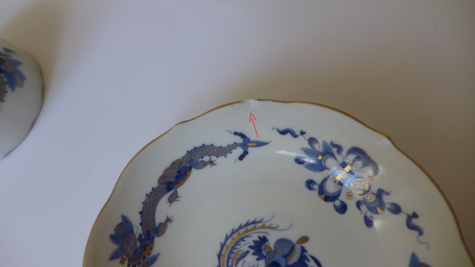 gebrauchter Zustand , Gebrauchs - Lagerspuren siehe Fotos , Untertasse mit Rand - Chip siehe Foto mit Pfeil , sonst in guter Erhaltung , 1.Wahl , keine Schleifstriche vorhanden , Goldschattiert - Goldrand , Kobaltblau , Lichtspiegelungen , Schattenbildung , Farbabweichungen können beim fotografieren