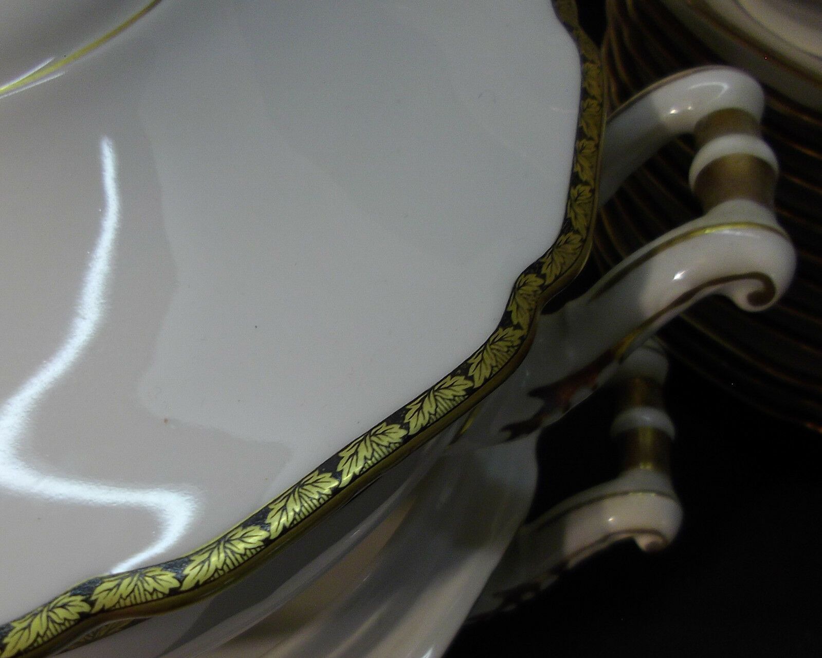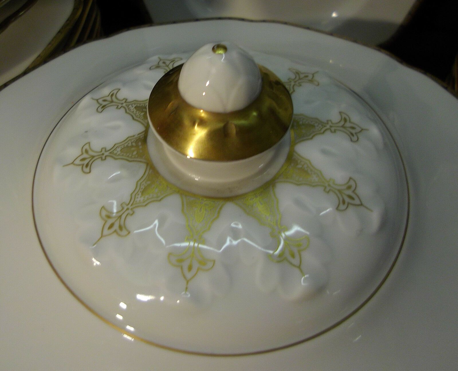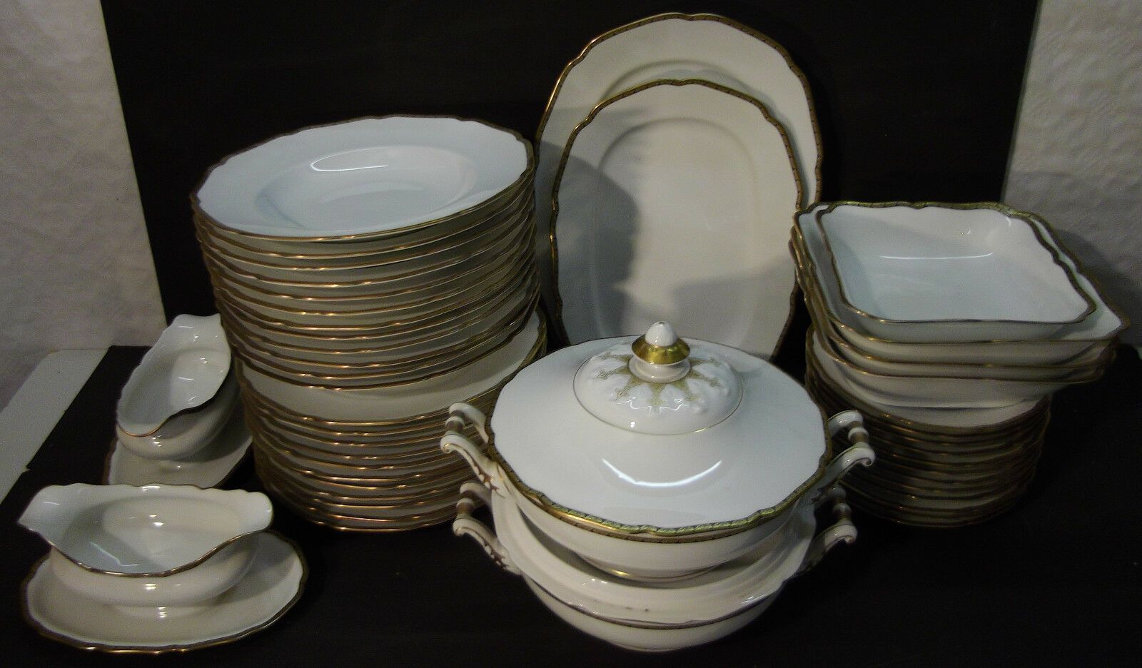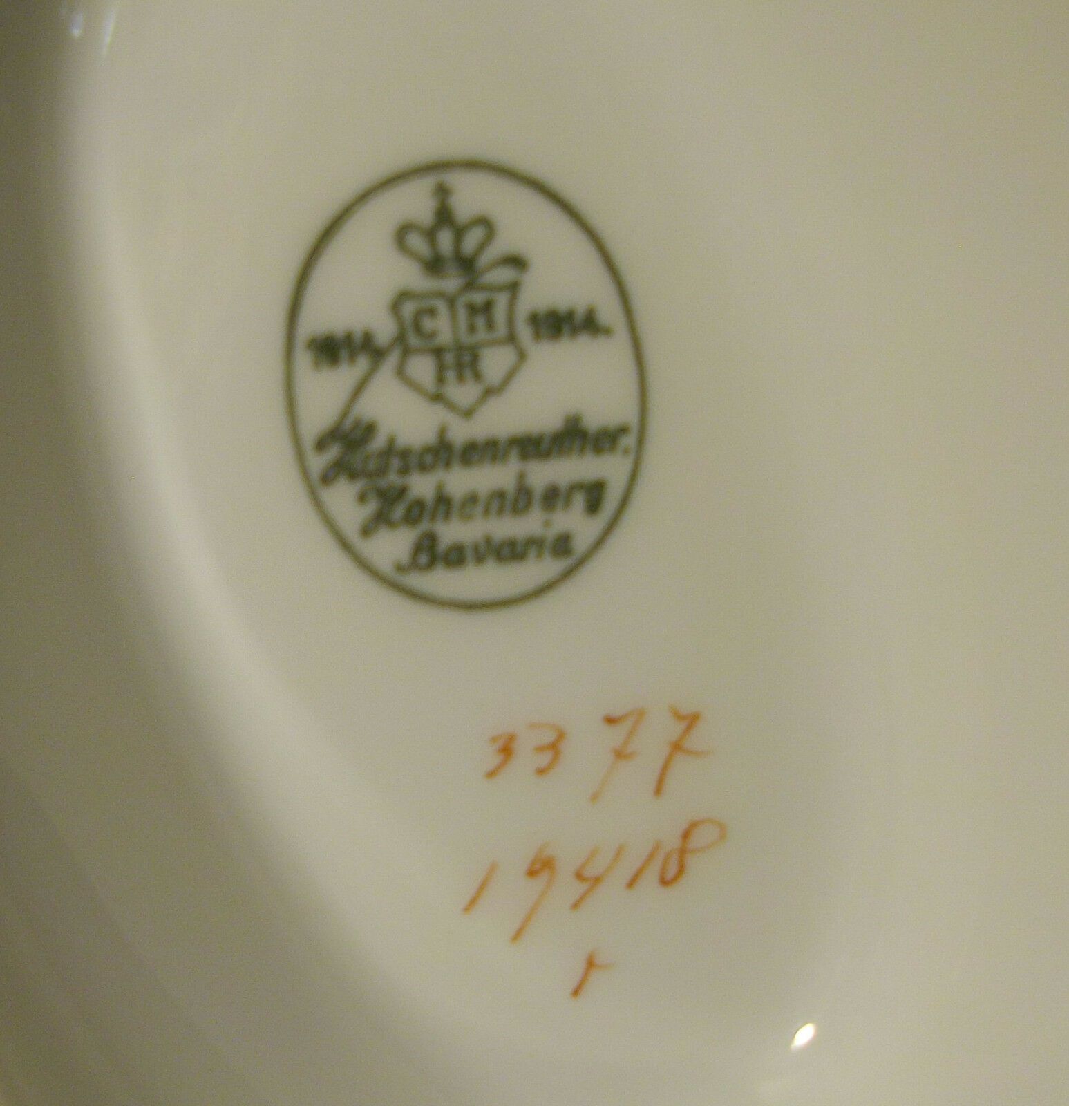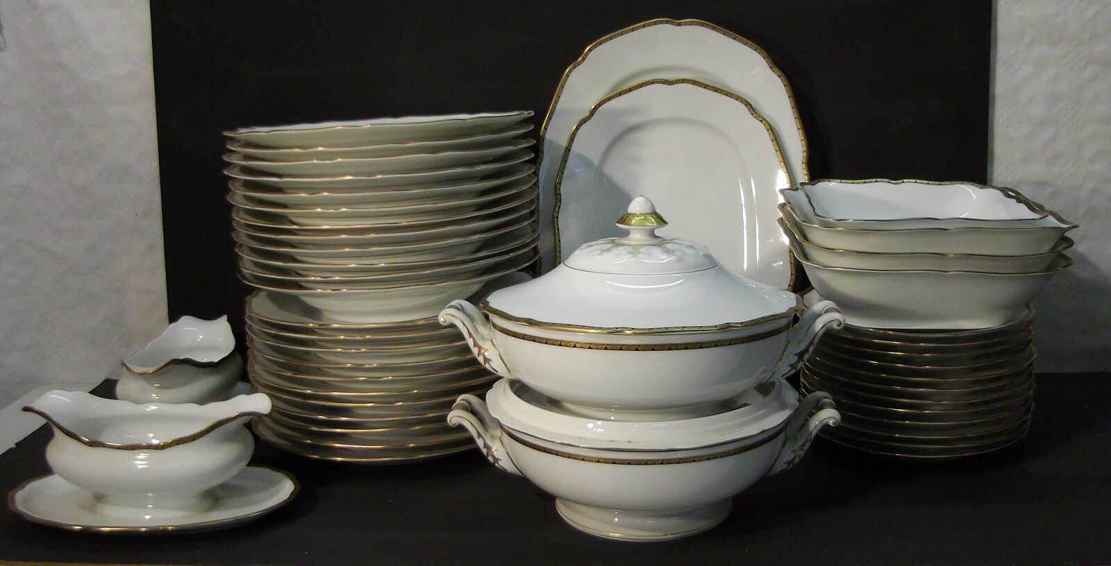 Ess-Service Speise-Geschirr um 1960 . Marke: Hutschenreuther Hohenberg Bavaria. Insgesamt 48 Teile! Bestehend aus: 2 Deckelschüsseln, 2 Vorlege-Platten, 4 offene Schüsseln, 2 Saucieren, 12 Kuchenteller, 12 Suppenteller, 12 Essteller. Sehr guter Zustand. Nur 1 Essteller mit geklebtem Riss! Antikes am