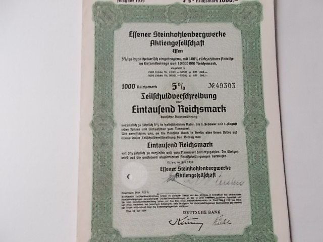 Essener Steinkohlenbergwerke AG Teilschuldverschreibung 1000 Reichsmark von 1939 5% Nr 49303
