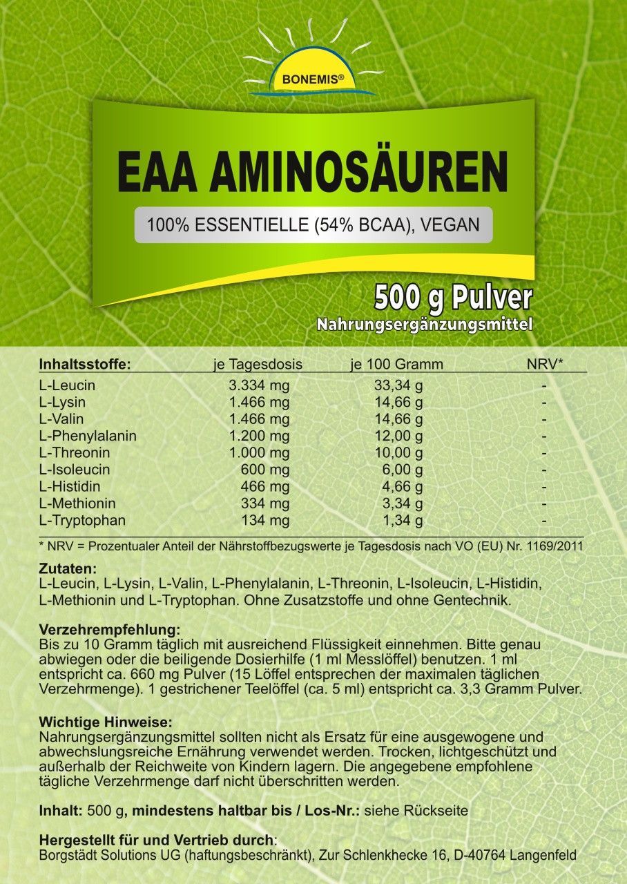 Essentielle Aminosäuren (100% EAA, davon 54% BCAA), vegan, ohne Zusätze, 500 g