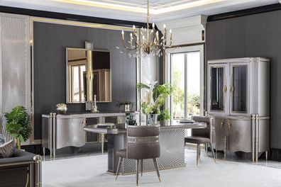 Esszimmer Set Grau Esstisch Luxus 4x Stühle Anrichte Spiegel Vitrine Luxus 8tlg