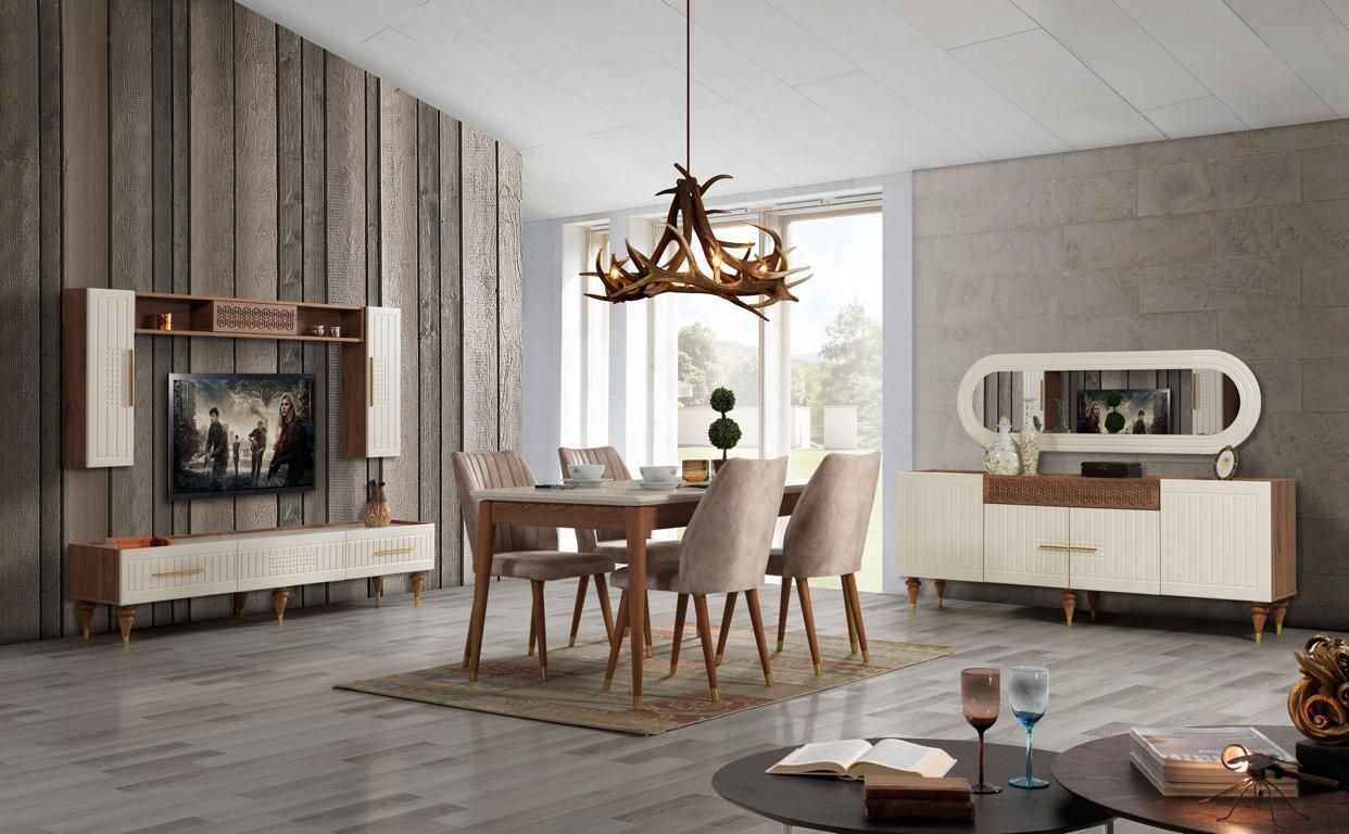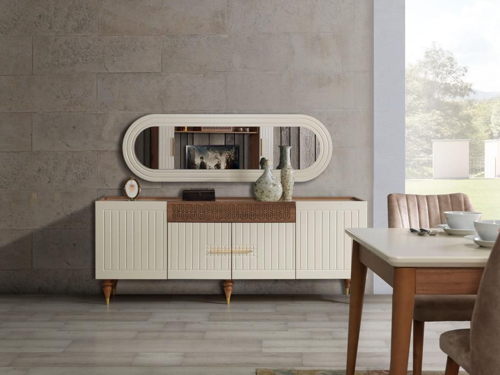 Esszimmer-Set mit Tisch, 6 Stühlen, Sideboard und Spiegel