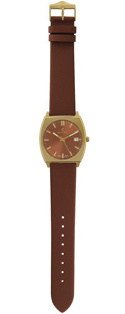 limitierte Auflage von 100 Stück, gold ionen-plattiertes Edelstahlgehäuse, Lünette satiniert, 4-fach verschraubter Boden, Saphirglas, Breite 36 mm, Höhe 8 mm, wasserdicht bis 5 bar, braunes Lederarmband, gold ionen-plattierte Edelstahl-Dornschließe, Schweizer 3-Zeiger-Quarzwerk, Datum, braunes Sonnenschliff-Zifferblatt, erhabene polierte Indexe, Superluminova Leuchtzeiger, Retro-Style