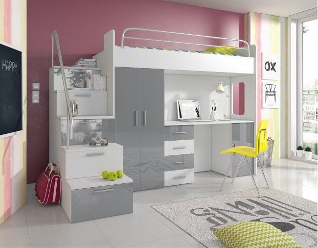 Etagenbett ALICE - Doppelstockbett Hochglanz Weiss Grau Kinderbett Hochbett