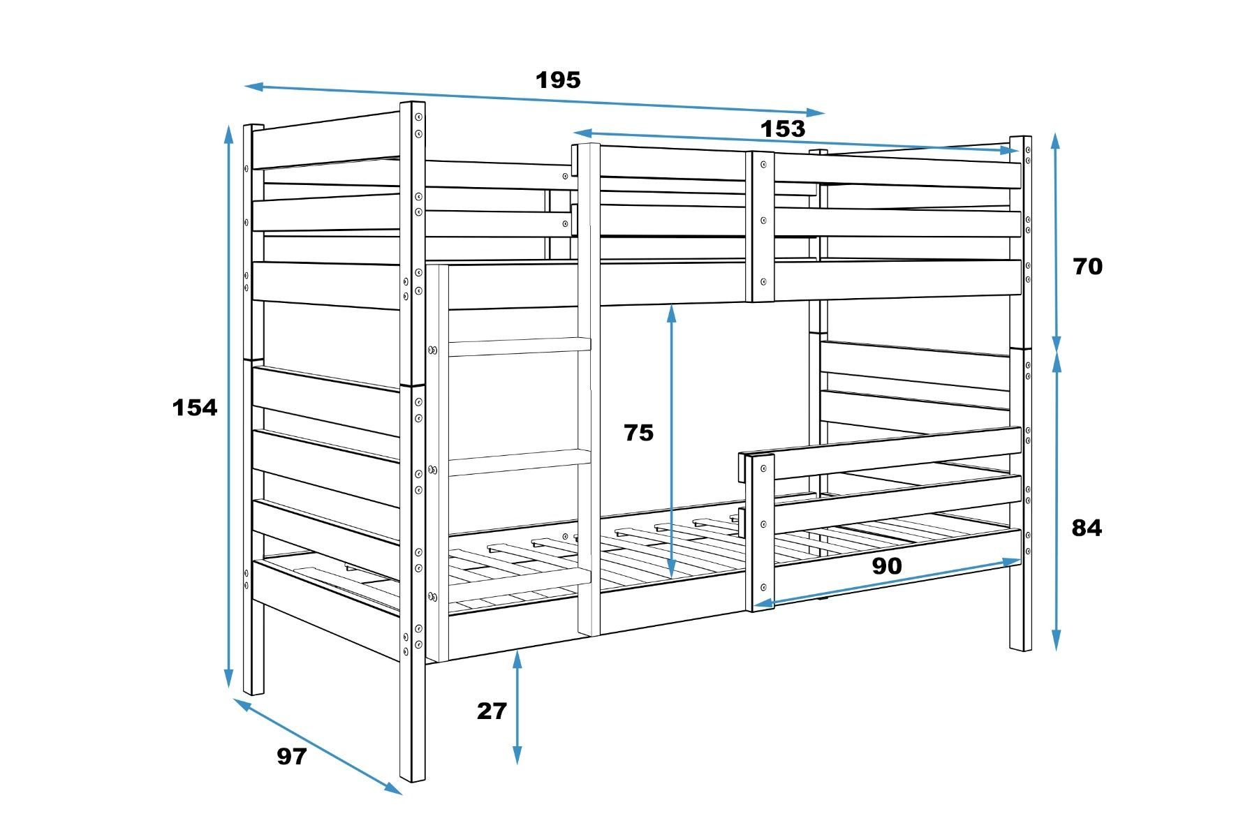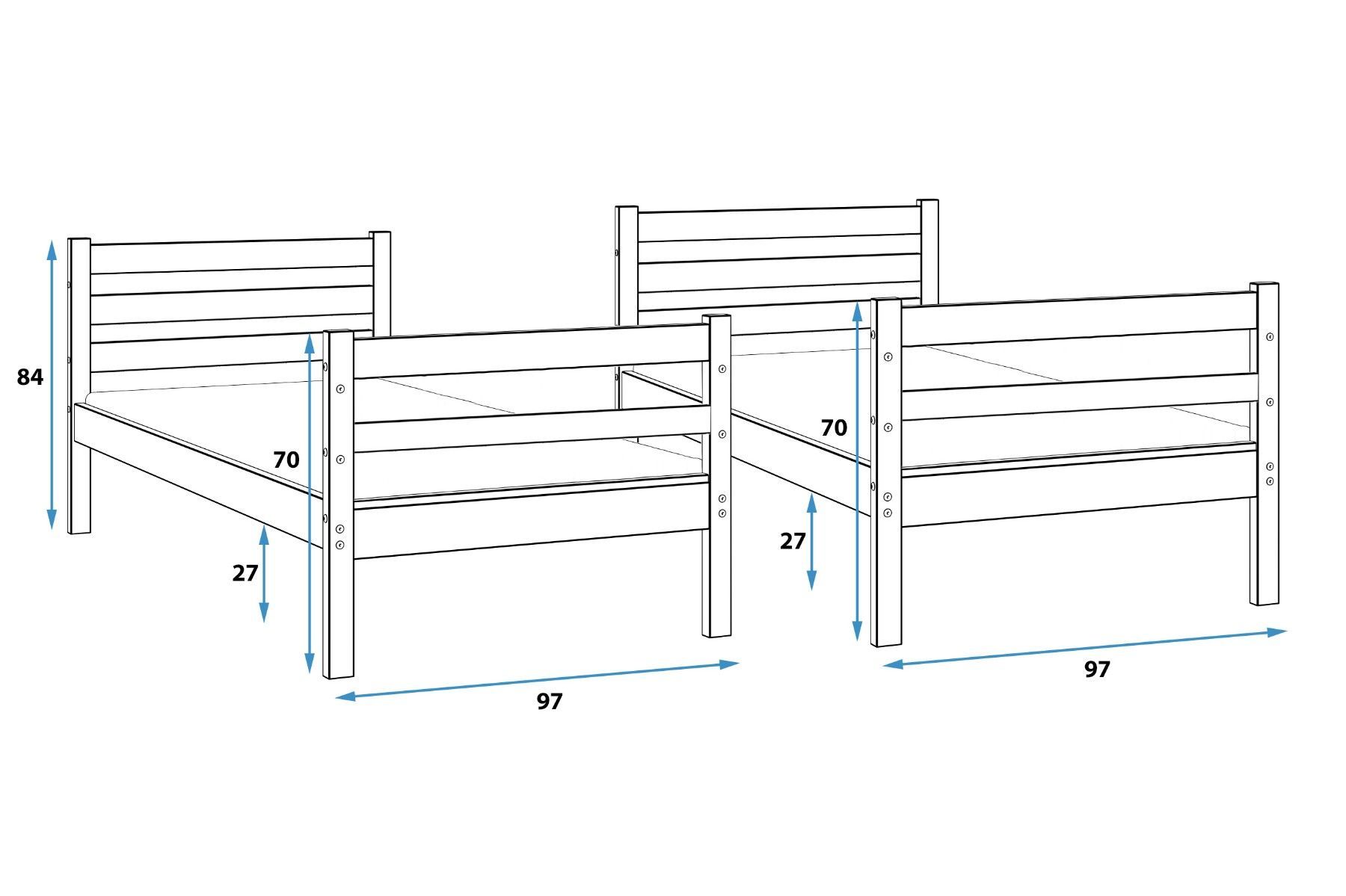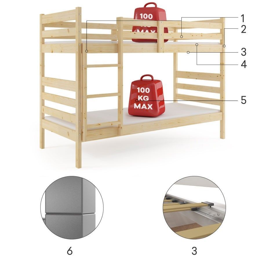 Etagenbett Eryk 190x90cm aus Kiefernholz roh, mit Lattenrost
