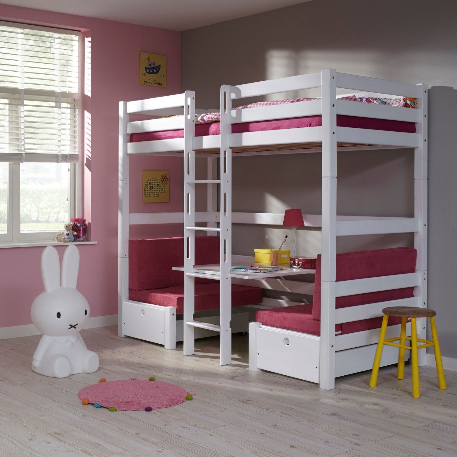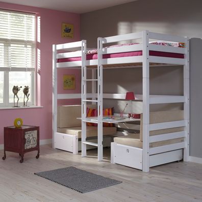 Etagenbett Finley Buche 90x200 cm Weiß mit Sitzgelegenheit und Kissen