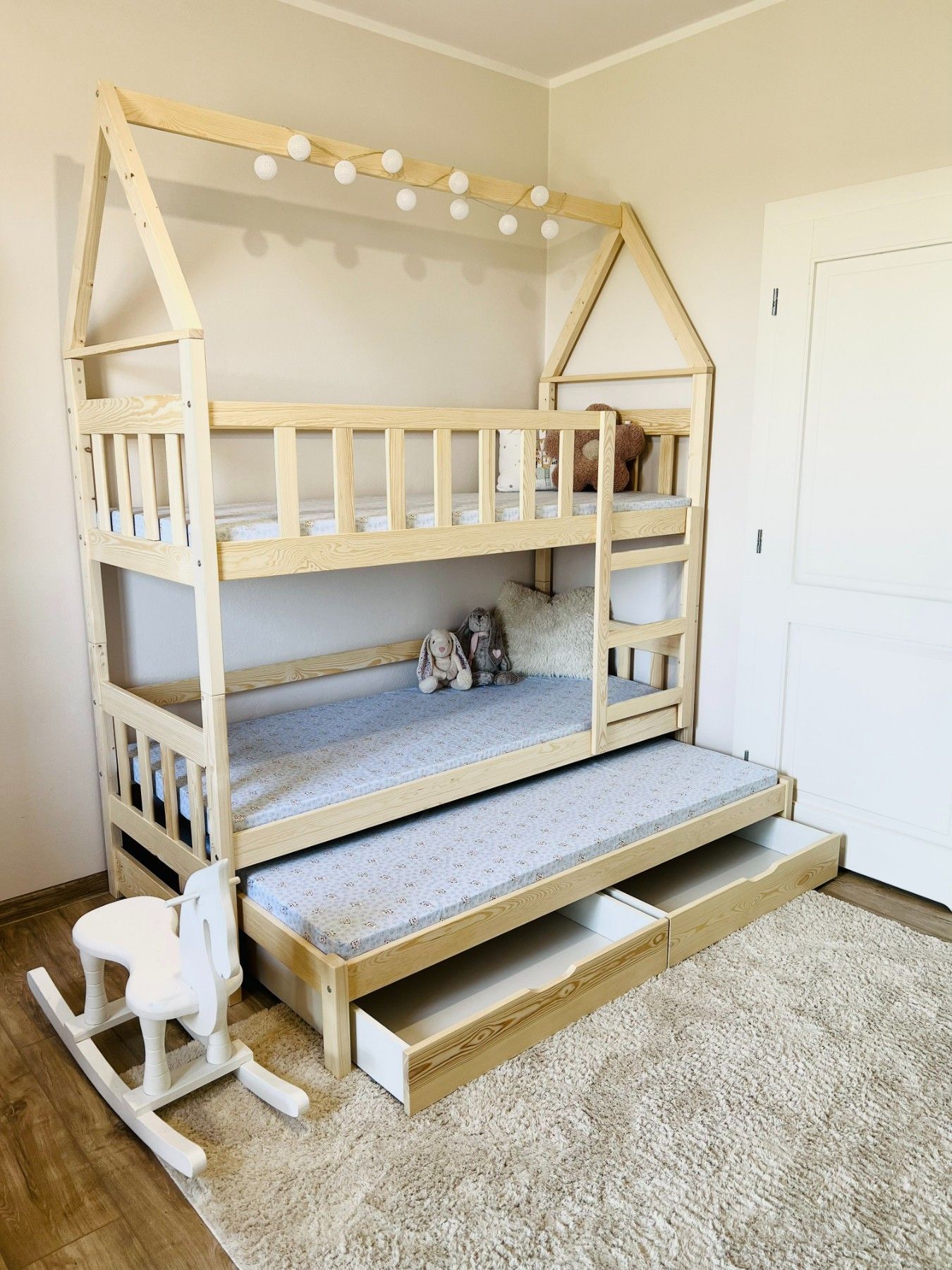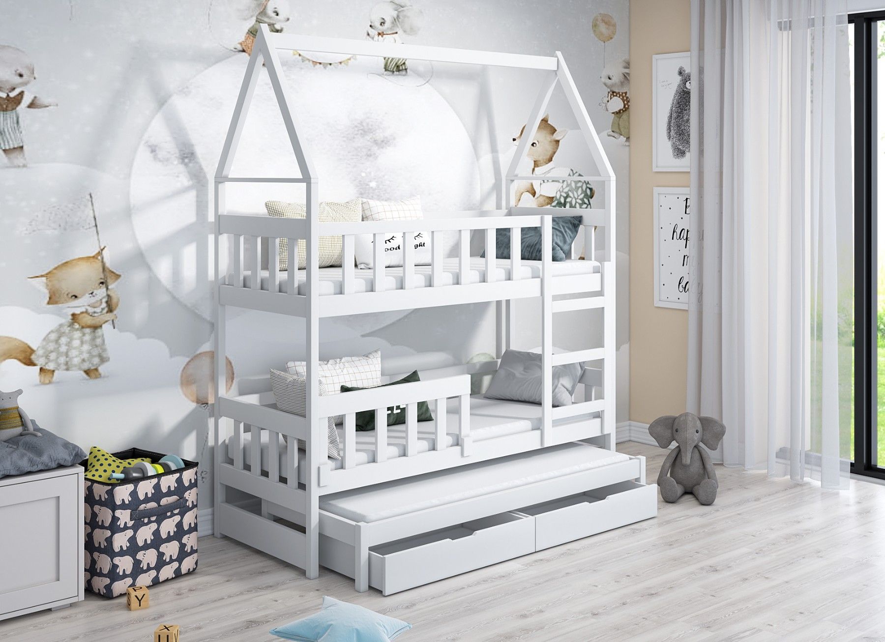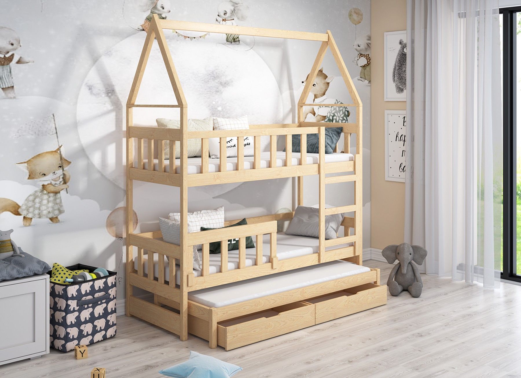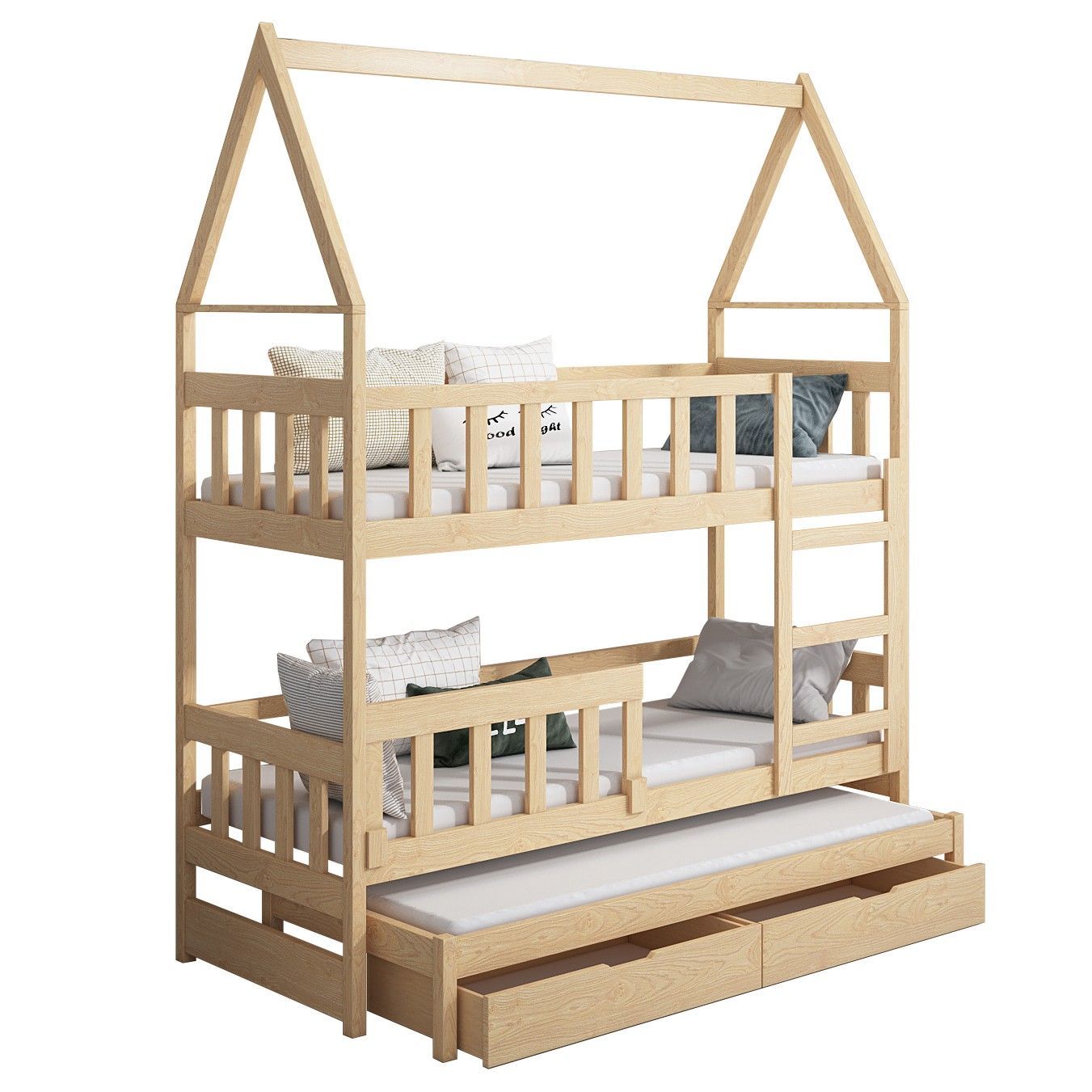 Etagenbett Hütte Kinderbett Hochbett House, 3 Matratzen 180x75 cm inklusive