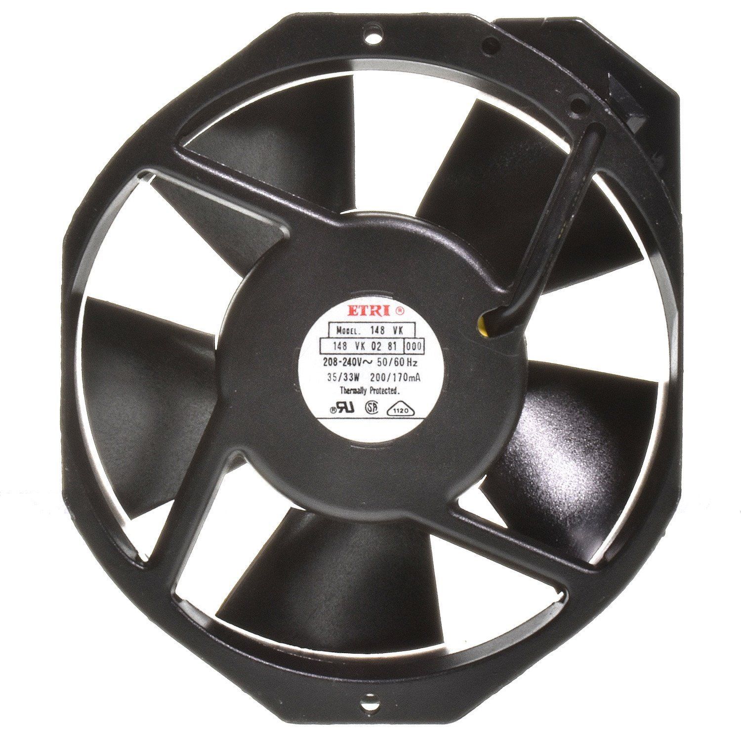 ETRI 148VK 0481000B Lüfter mit Thermo Schutz 208-240 VAC 150mm x 172mm x 38mm Leistungsaufnahme: 35 33W Drehzahl: 2800 U min. , 3200 U min. Frequenz: 50 60 Hz Temperaturbereich: -10...+55°C Geräusch max.: 57 dB Volumenstrom max.: 421m³ h Lagerung: Kugellager Gewicht: 1100 g Aus alten Lagerbeständen,