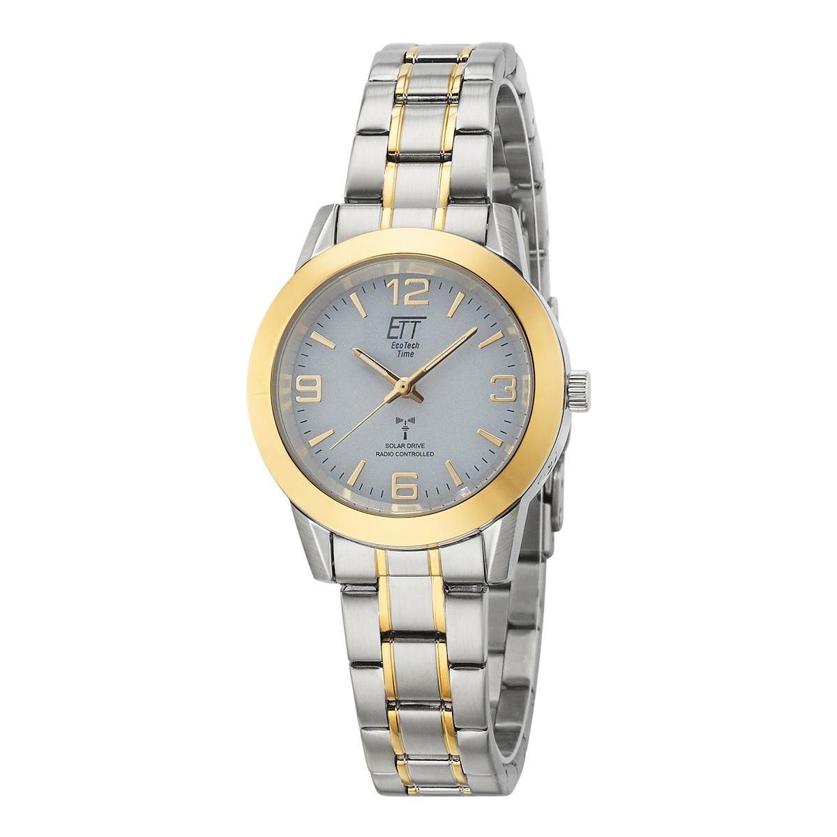 Die Bicolor ETT Damenuhr, Solar Drive Funk Basic ELS-11505-42M, mit Metallband überzeugt mit ihrem sportlichen Design. Automatische Umstellung von Sommer-und Winterzeit. Dank Solar Funk Antrieb geht die ETT Solar Drive Funk Uhr stets genau und benötigt keinen Batteriewechsel. Ausgestattet ist Sie mi