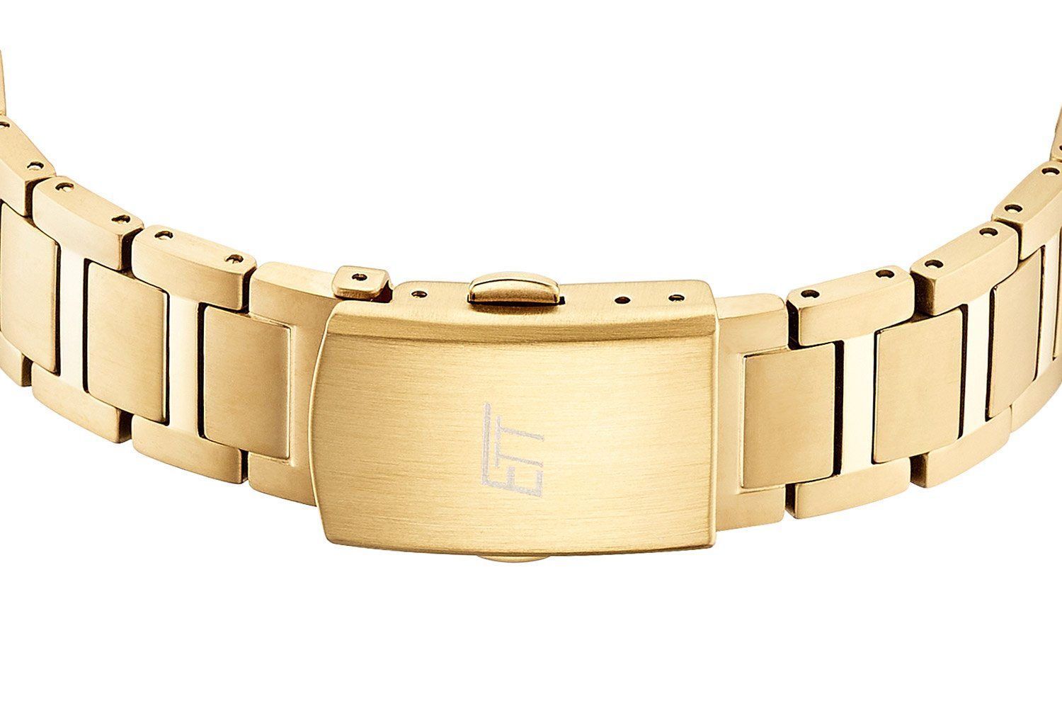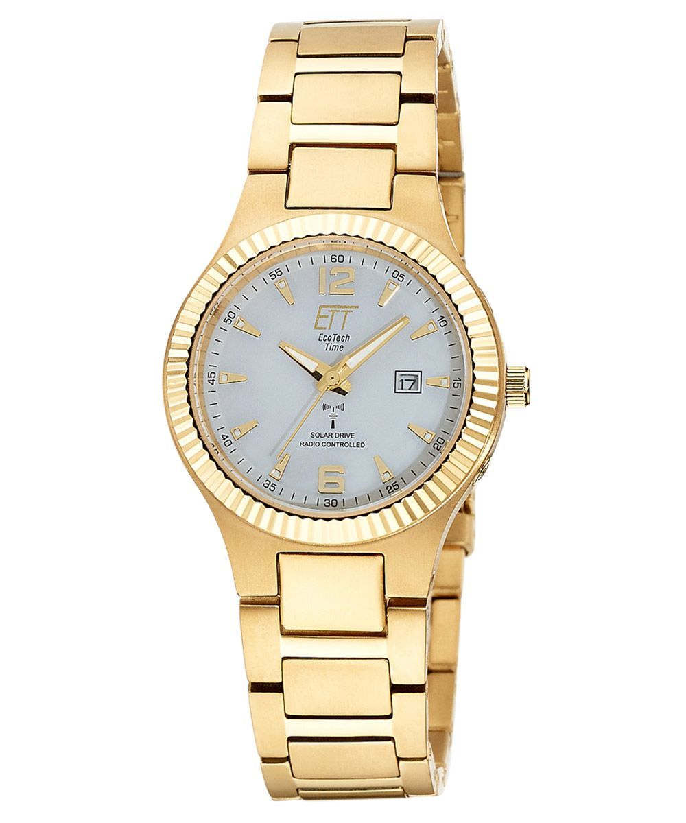 edle Funkuhr für Frauen mit Solarantrieb, Funk-Solar-Uhrwerk TD2327, empfängt das Zeitsignal DCF77 aus Mainflingen, Deutschland, kein Batteriewechsel erforderlich, Dunkelgangreserve bis zu 180 Tage, Überladeschutz, Niedrigenergie-Anzeige, Sleepfunktion, funkgesteuerte automatische Zeitumstellung von Sommer- und Winterzeit, ewiger Kalender, Datumsanzeige, weißes Zifferblatt, lumineszierende Zeiger und Stundenpunkte, goldfarbene Zahlen und Indizes, Gehäuse aus mattiertem Titan, gold ionen-plattier