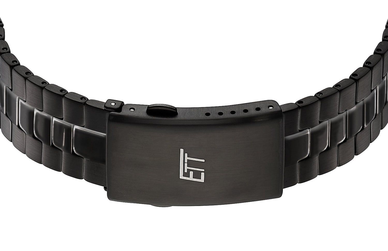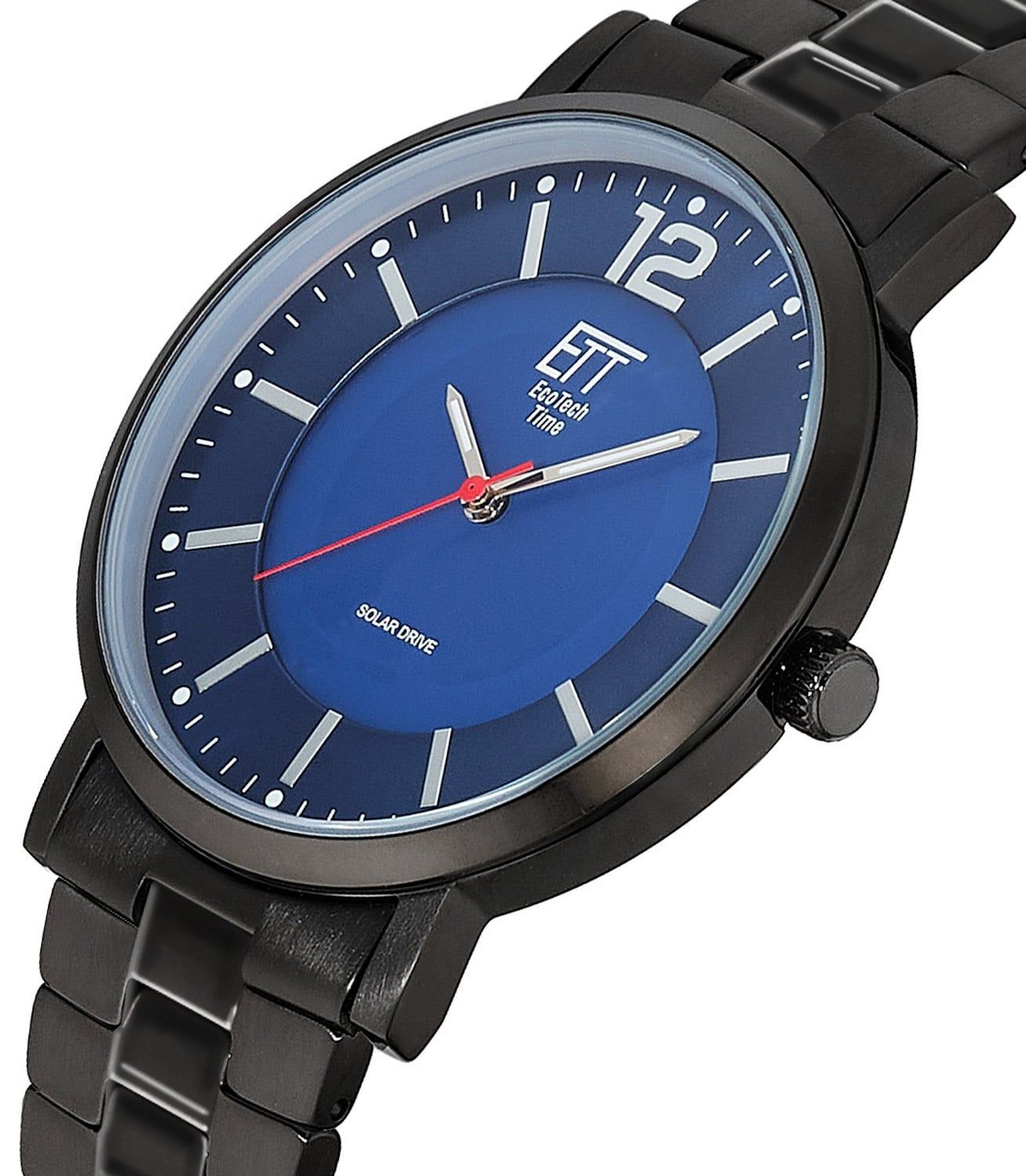 trendige Uhr mit Solarantrieb für Männer, Solar-Uhrwerk AS01, kein Batteriewechsel erforderlich, Dunkelgangreserve bis zu 120 Tage, Niedrigenergieanzeige, blaues Zifferblatt, lumineszierende Zeiger und Stundenpunkte, polierte Zahl und Indizes, poliertes Edelstahl-Gehäuse, schwarz plattiert, kratzunempfindliches Mineralglas, Armband aus mattem, schwarz plattiertem Edelstahl mit polierten Details, Sicherheitsfaltschließe, wasserdicht bis 5 bar, Breite (ohne Krone) 40 mm, Höhe 8,5 mm