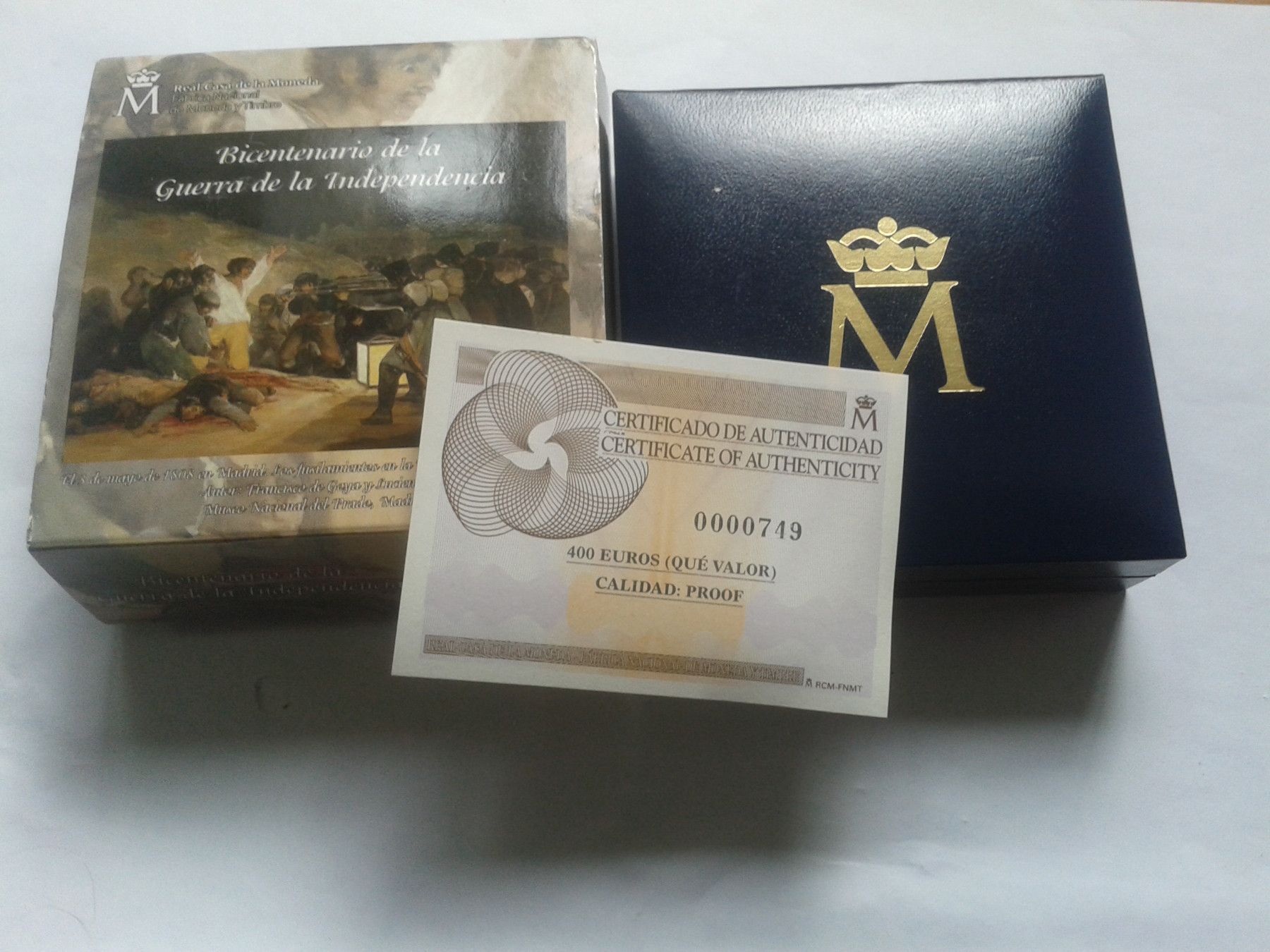 Etui, Zertifikat und Schleife für 400 euro 2008 PP Spanien Unabhängigkeit 27g Gold