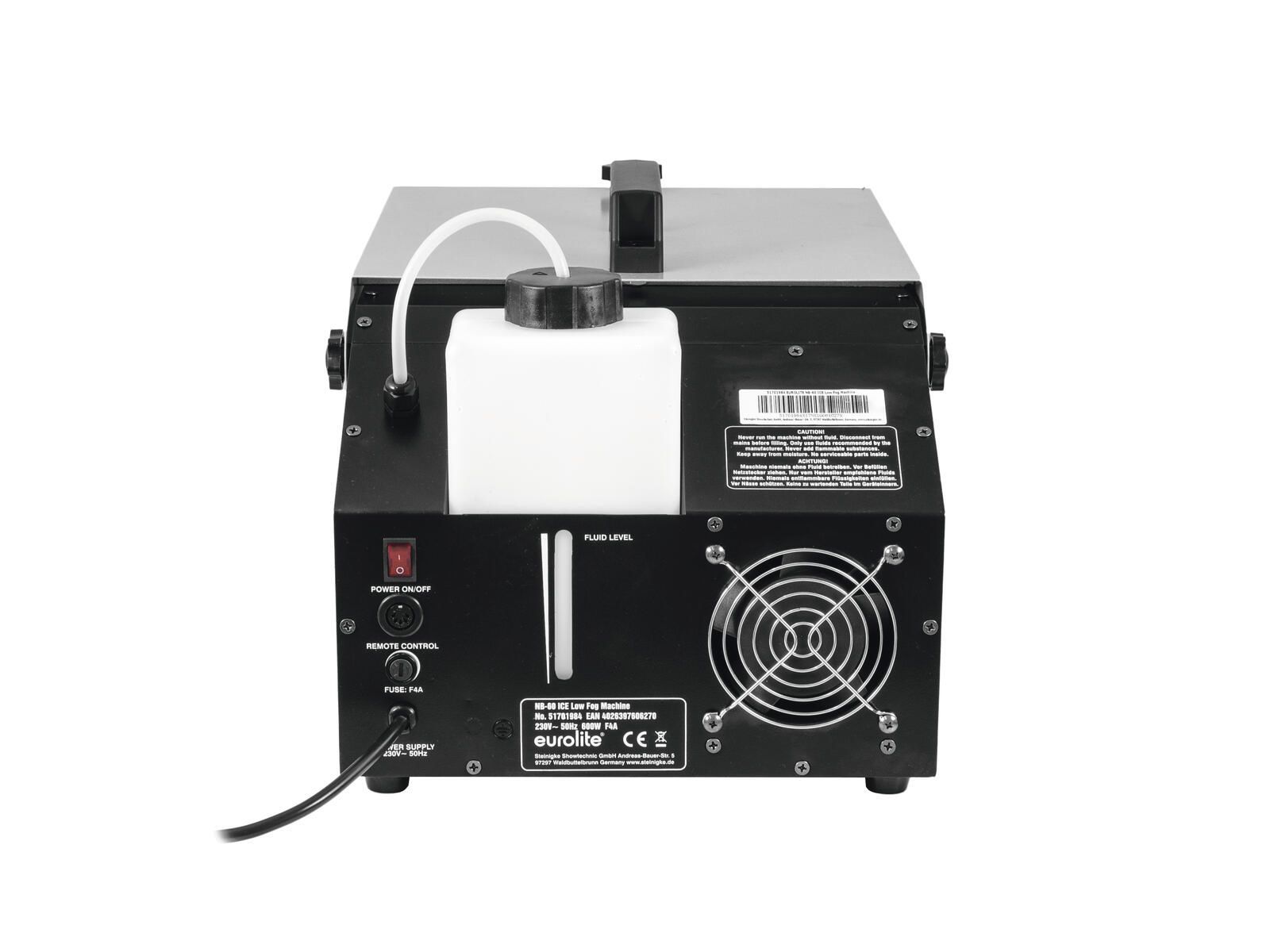 eurolite NB-60 MK2 ICE Kompakte Bodennebelmaschine (600 W), 1,2-Liter-Tank, Fernbedienung, Eiswürfelkühlung Niedriger Fluidverbrauch (ca 12 ml min) Kontinuierlicher Ausstoß Ablassvorrichtung für einfache Entleerung und Reinigung Stabiles Metallgehäuse Kurze Aufwärmzeit (ca 2 min) Ausstoßweite: ca. 3