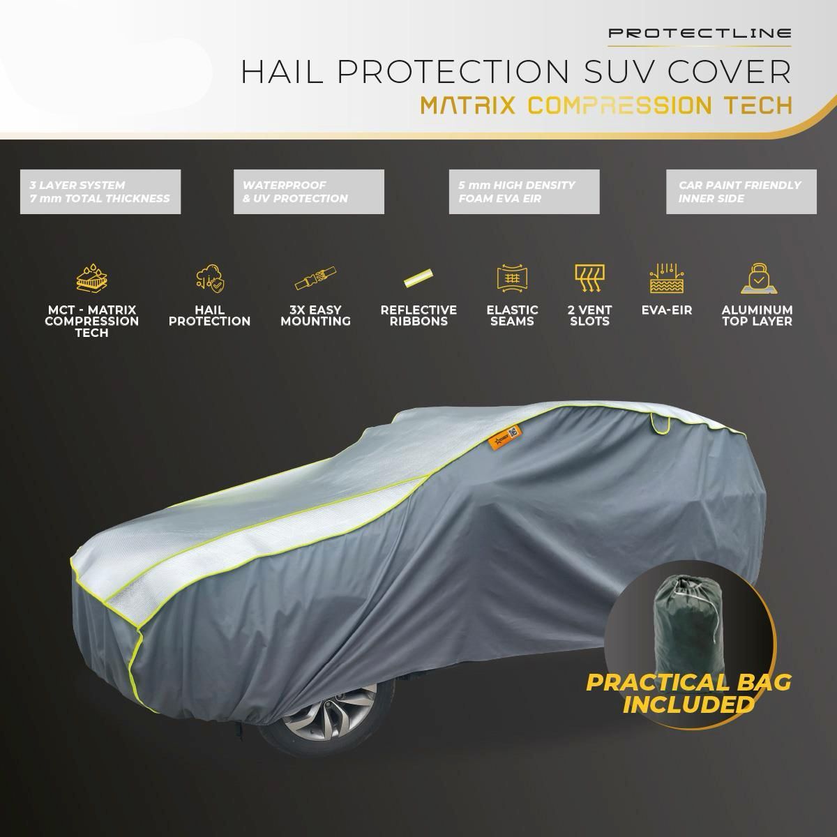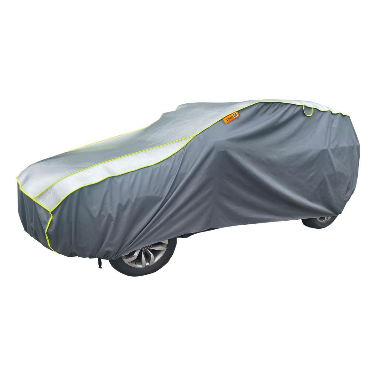 ? ERWEITERTE SCHUTZFLÄCHE: Durch die Vergrößerung der Hagelschutzfläche schützt unsere Abdeckplane auch die gefährdeten Seitenteile Ihres SUV auf Vorder- und Hinterseite. Dreieckige Reflektoren an Vorder- und Hinterseite verbessern die Sichtbarkeit bei Nacht.
