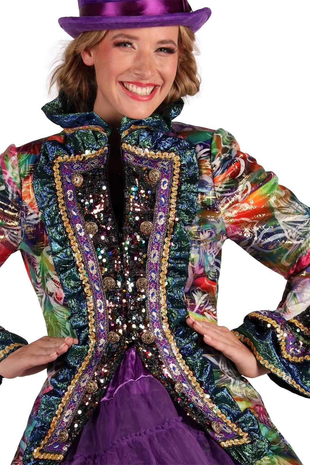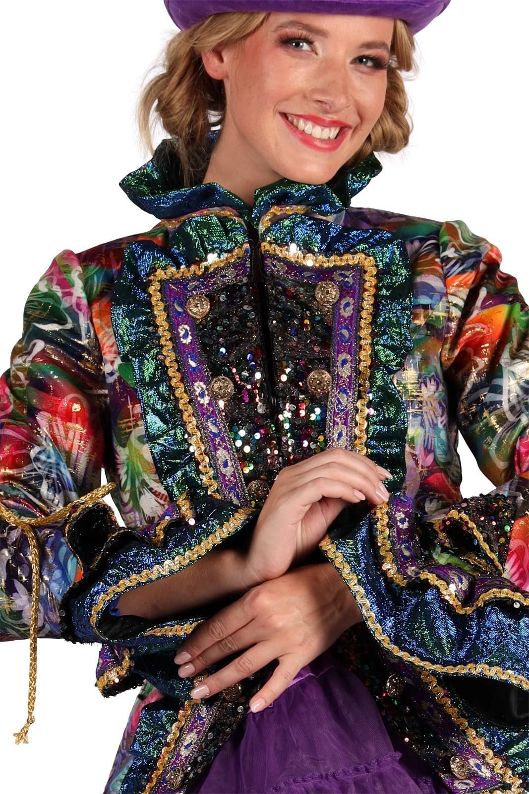 Ein absoluter Hingucker! Damenjacke Carneval Fiesta Gr. wählbar: M (40), L (42), XL (44) oder XXL (46) Diese außergewöhnliche Jacke überzeugt sofort durch ihre prachtvollen Farben und liebevoll gestalteten Details. Gefertigt aus samtigen Stoff mit zarten Goldakzenten, strahlt sie eine elegante, auße