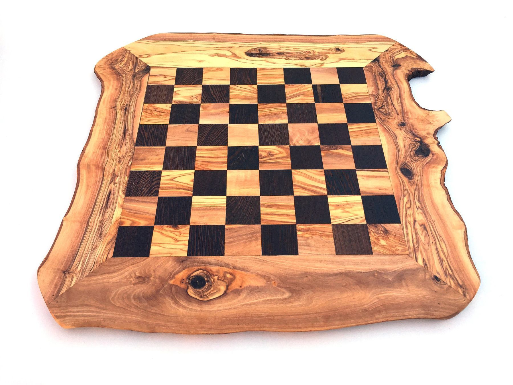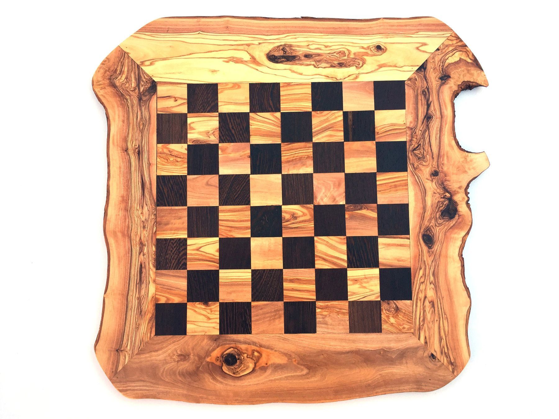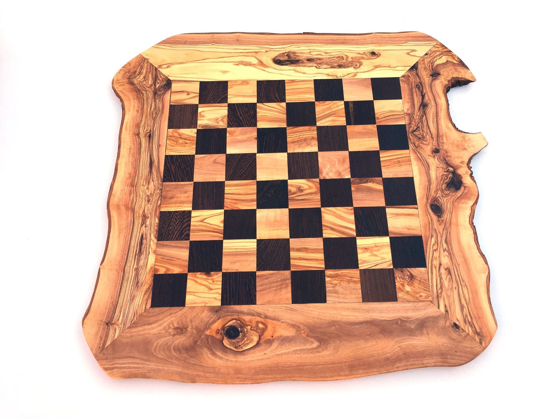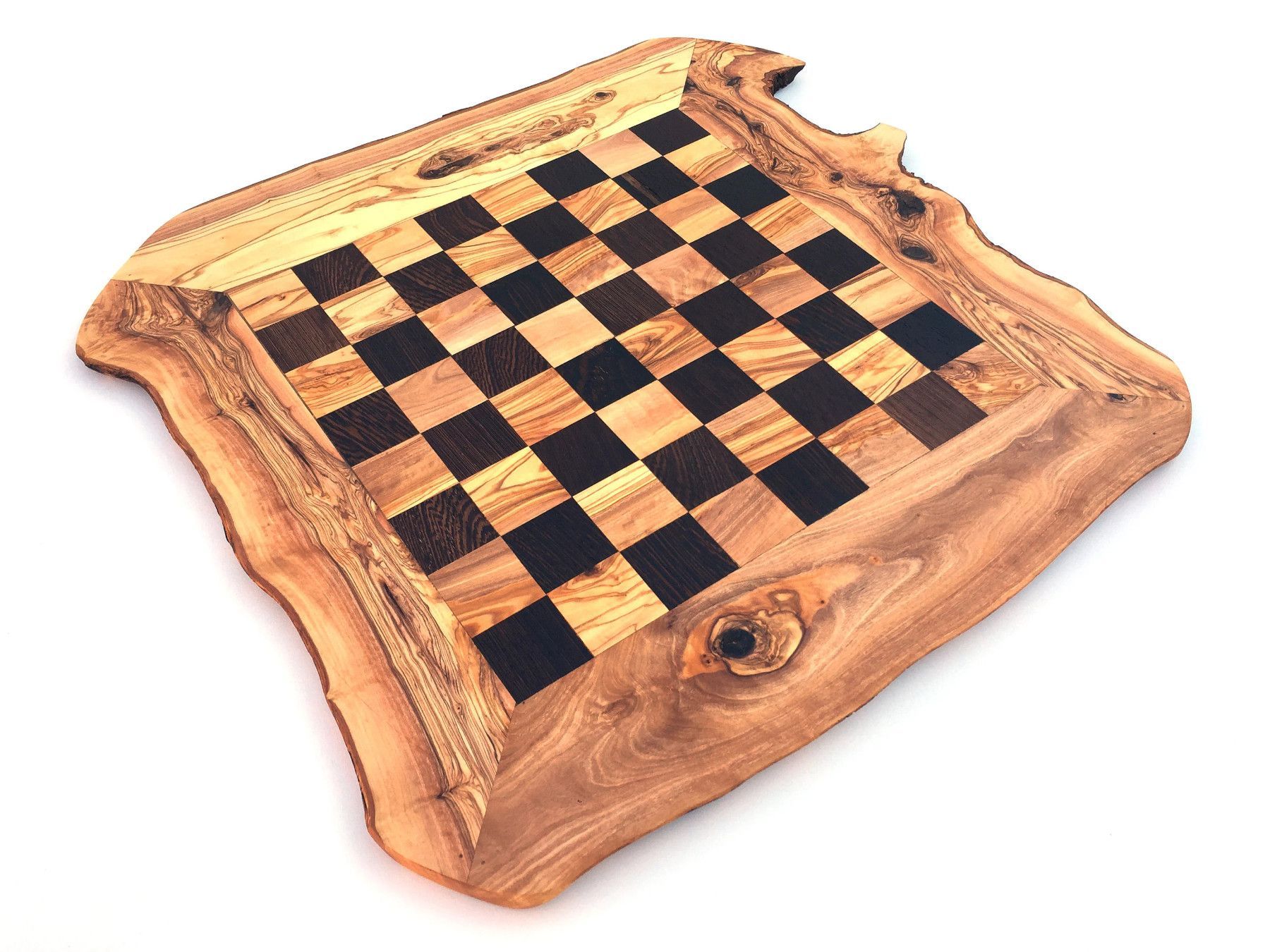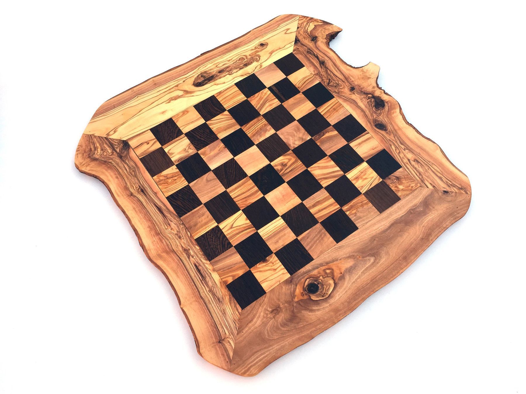 Schachspiel als Brett Größe wählbar M,L,XL Das Schachbrett mit der rustikalen Umrandung ist aus Olivenholz und in Handarbeit angefertigt. Der künstlerisch begabte Handwerker hat jedes Stück einzeln per Hand hergestellt, was jedes Stück zu einem Unikat macht. Die einzigartige rötlich-braune Maserung