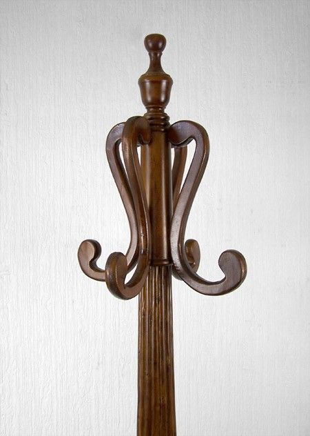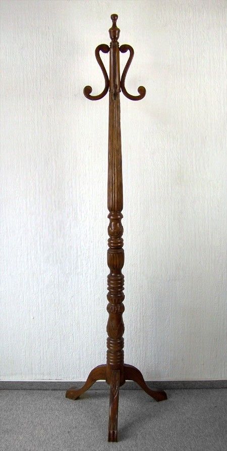 Dieser Kleiderständer im Antik-Stil mit seinen geschwungen Formen ist ein Verschönerung für jede Garderobe. Der Kleiderständer hat 4 Haken. Er wurde hergestellt aus Mahagoni-Holz und ist im Nussbaumton gehalten. Gesamtbreite ca. 49 cm Gesamthöhe ca. 200 cm