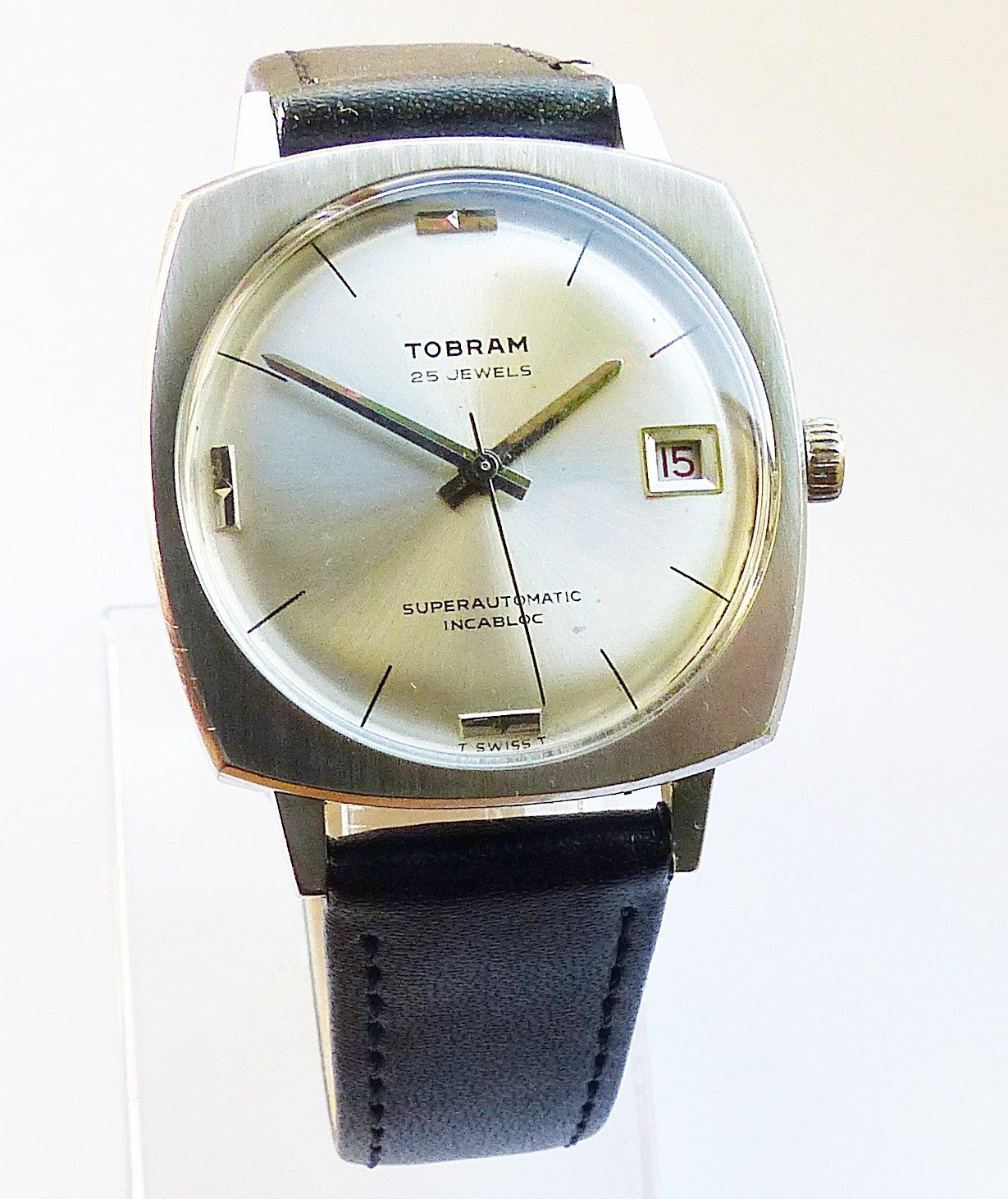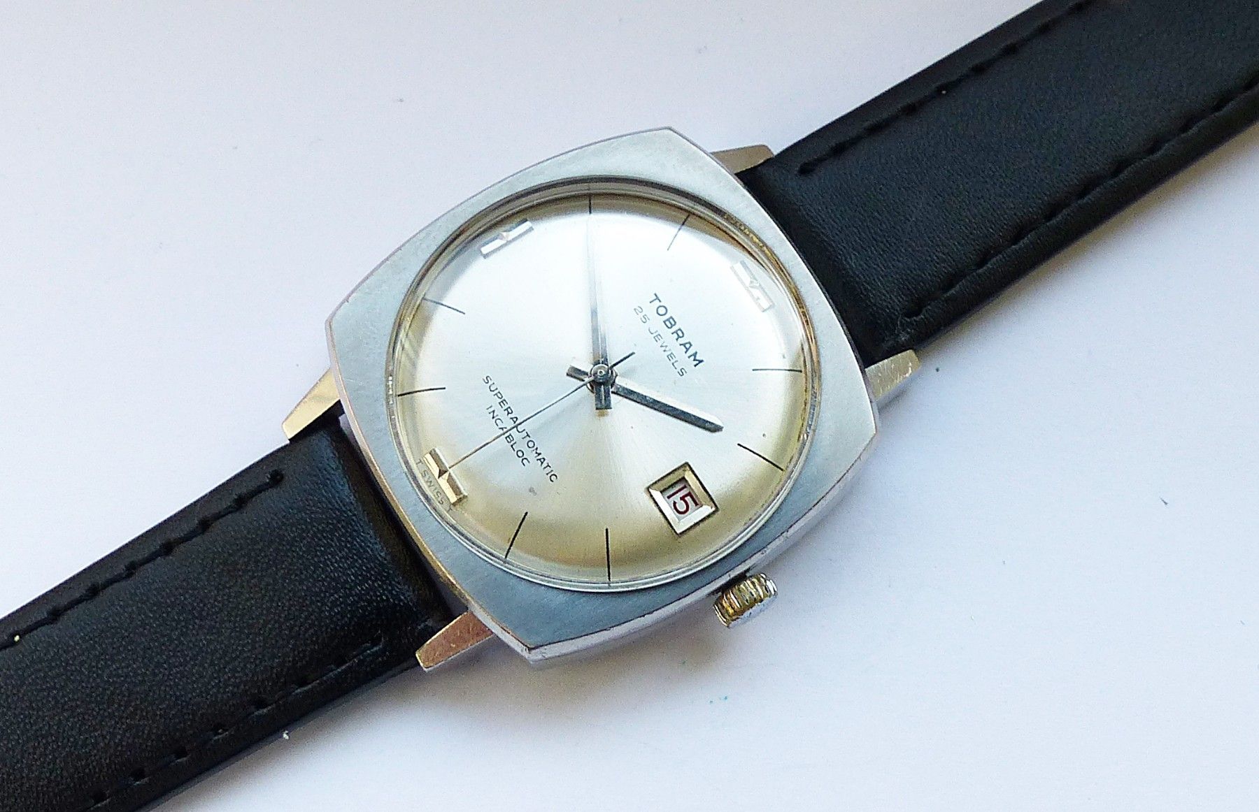 Schöne und seltene Tobram Swiss Superautomatic Calendar Herren Vintage Armbanduhr mit Silbernem Zifferblatt und aufgesetzten Silbernen Strichindexen, grosser zentraler Sekunde, Datum bei 3.00 Uhr. Die Uhr ist voll funktionsfähig und in Top gepflegten Zustand s. Fotos Uhrwerk : Kaliber Felsa 2452 Aut