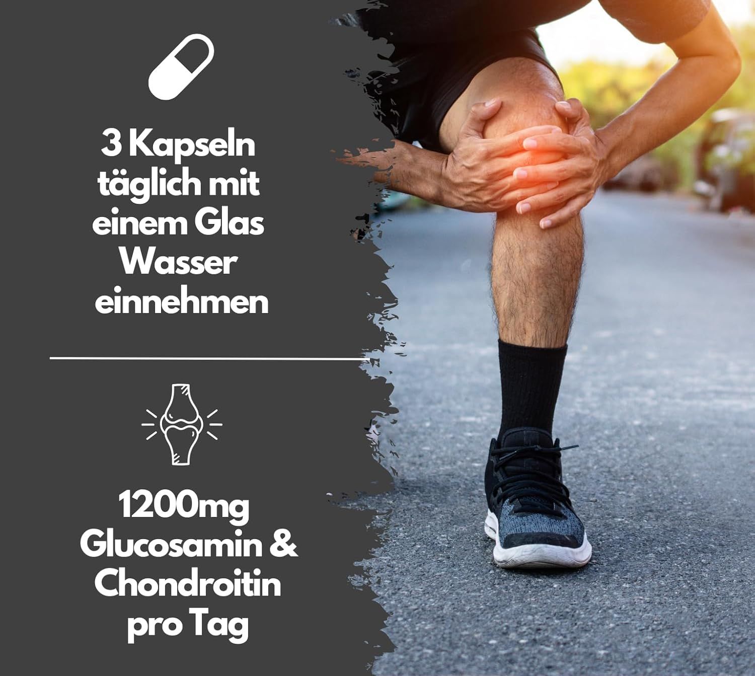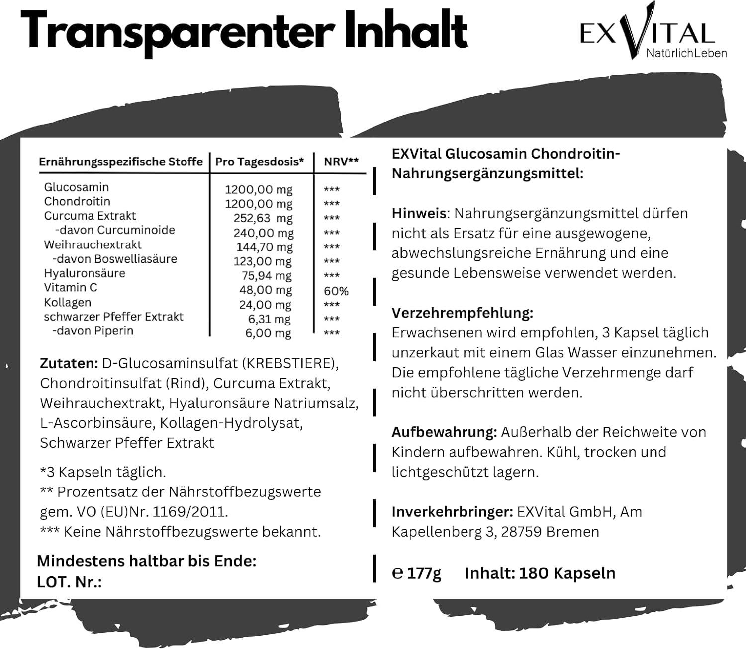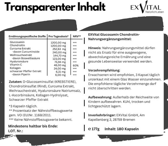 • Zutaten: D-Glucosaminsulfat (KREBSTIERE), Chondroitinsulfat (Rind), Curcuma Extrakt, Weihrauchextrakt, Hyaluronsäure Natriumsalz, L- Ascorbinsäure, Kollagen-Hydrolysat, Schwarzer Pfeffer Extrakt