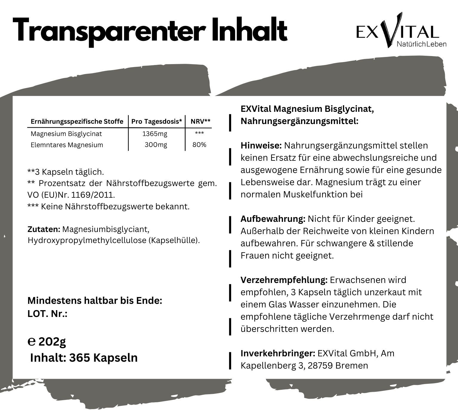 EXVital® Magnesiumbisglycinat, hochdosiert 1365mg pro Tag, vegan