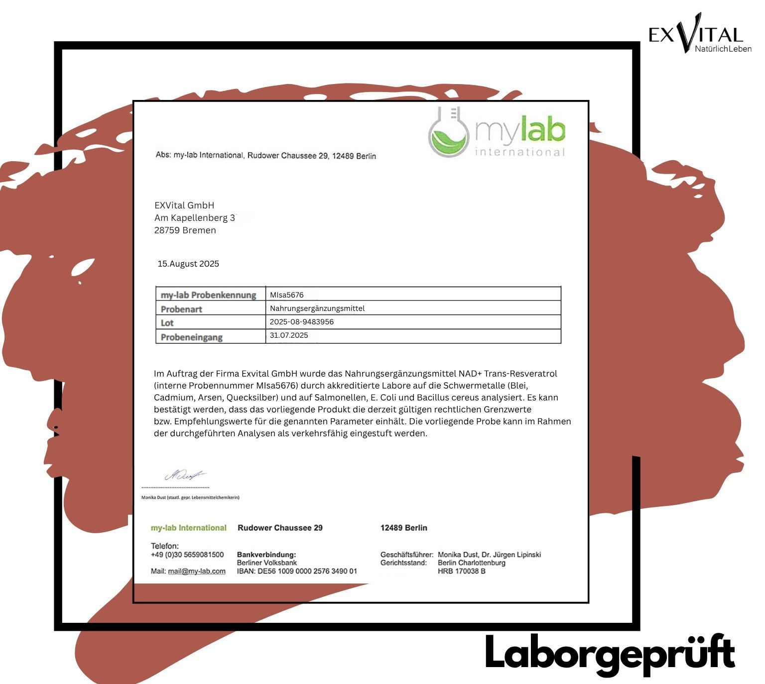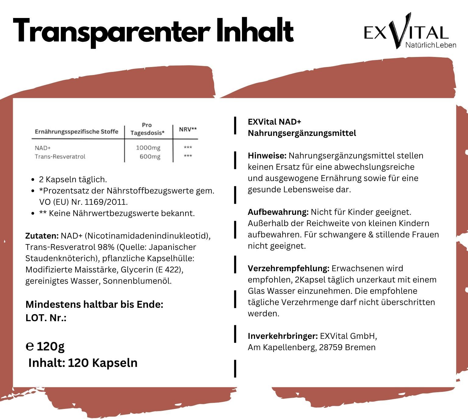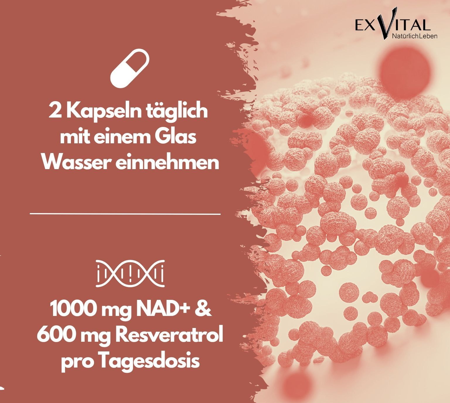 EXVital® NAD+ Kapseln, hochdosiert 1000mg NAD+ & 600mg Trans-Resveratrol pro Tag, 120
