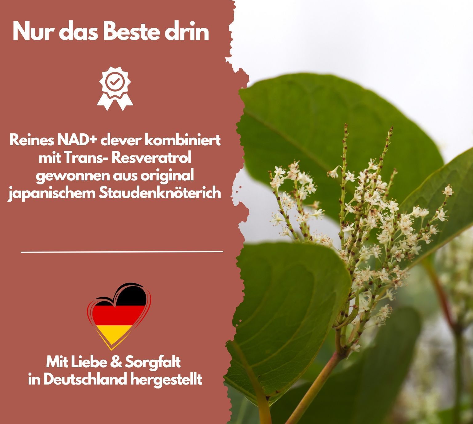 • Bestandteile: NAD+ (Nicotinamidadenindinukleotid), Trans-Resveratrol 98% (Quelle: Japanischer Staudenknöterich), pflanzliche Kapselhülle: Modifizierte Maisstärke, Glycerin (E 422), gereinigtes Wasser, Sonnenblumenöl.