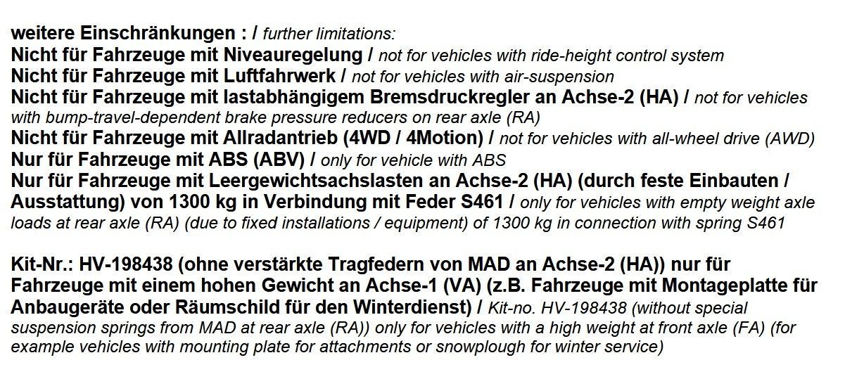 MAD Cross Country Federn / verstärkte Höherlegungsfedern für die Vorder- und die Hinterachse Passend für: VW ID. BUZZ inklusive Cargo Typ EB / EBA - EBB ab Baujahr 04/2022 - Bitte beachten Sie: Durch die Verstärkung / den Austausch der Federn erfolgt eine Höherlegung des Aufbaus an Achse-1 (VA) um ca. 30mm und an Achse-2 (HA) um ca. 30/30 mm Lieferumfang: 1x MAD Höherlegungsset für die VA + HA Teilenummer: HV-198441
