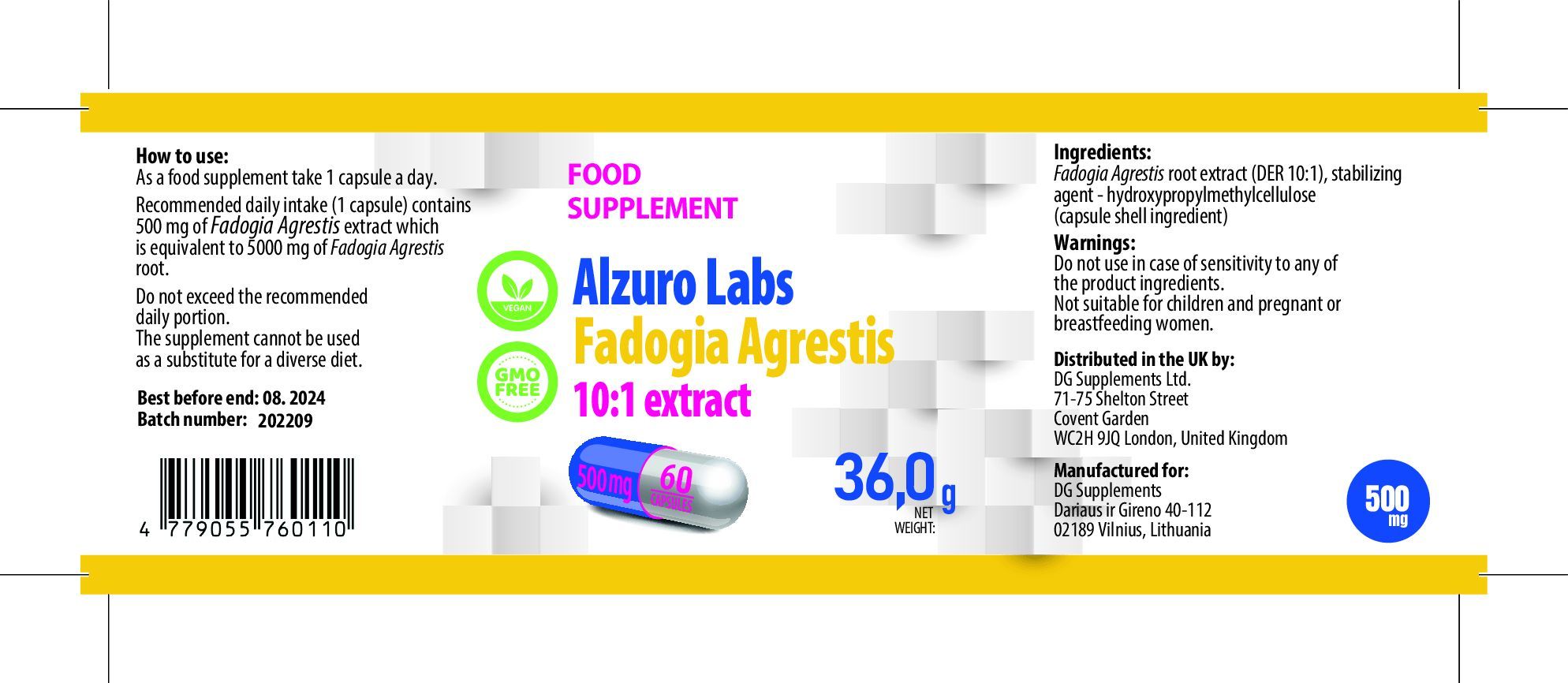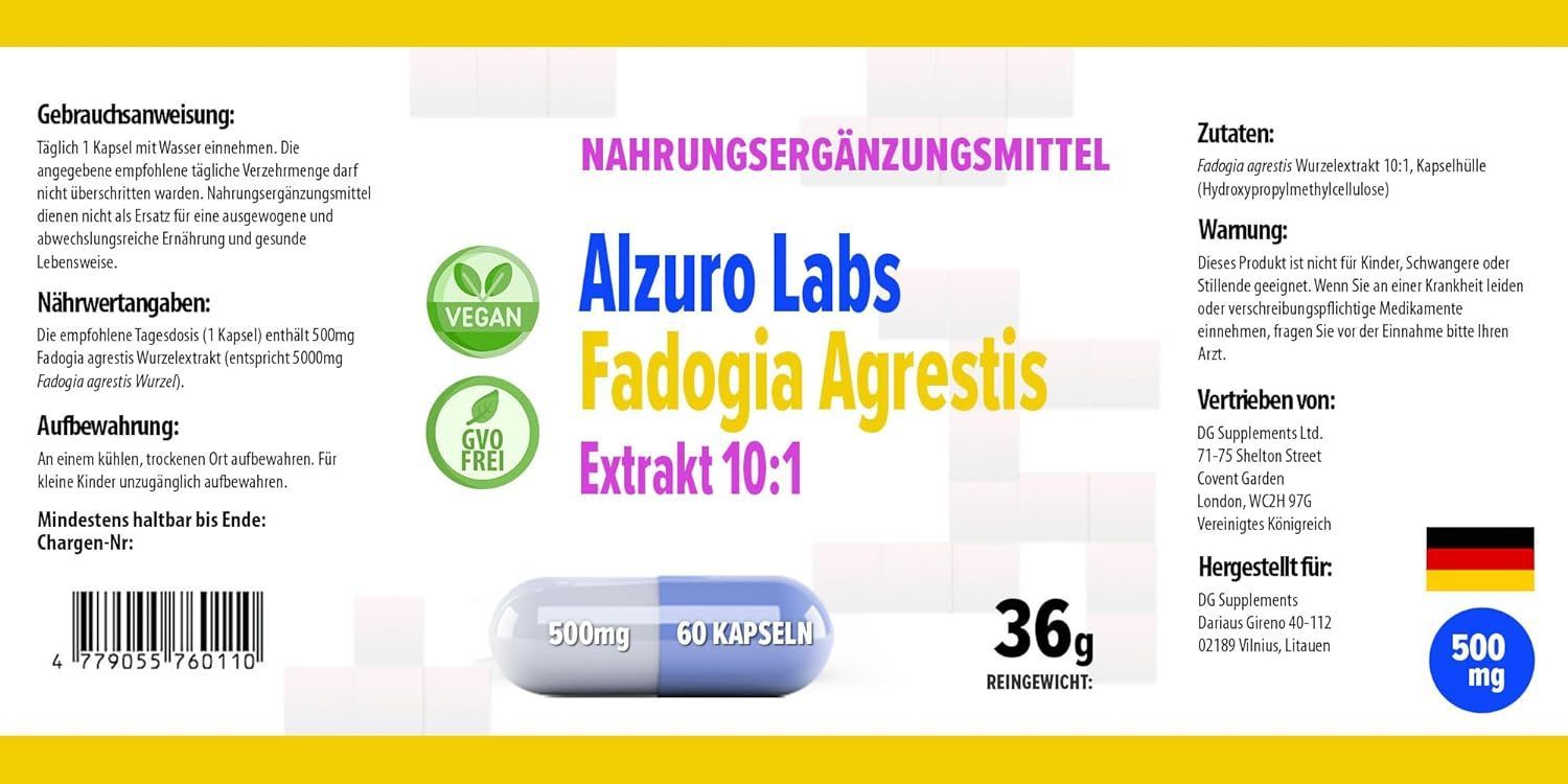 Fadogia Agrestis 5000mg Äquivalent (500mg von 10:1 Extrakt) 60 Vegan Kapseln