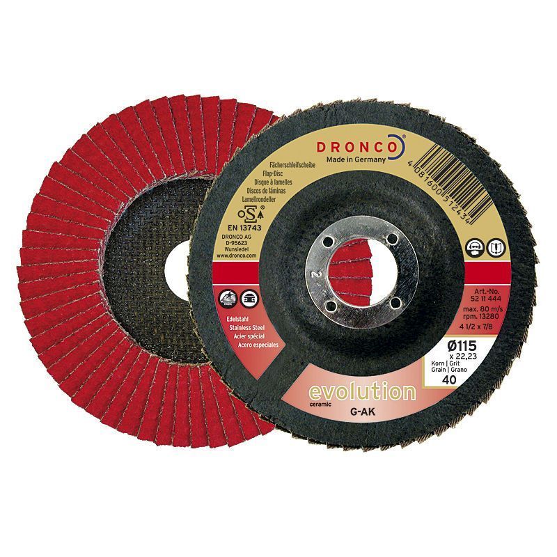 zum Verkauf steht eine Fächerschleifscheibe 115 x 22,23 , von Dronco Keramikkorn - Durchmesser 115mm - Bohrung 22,23mm - max. Umdrehungszahl: 13280U min - Form: Schräg - Träger: Glasgewebeteller - Schleifmaterial: selbstschärfendes Keramikkorn - zum Bearbeiten von: Stahl, Edelstahl hochlegierte Stäh