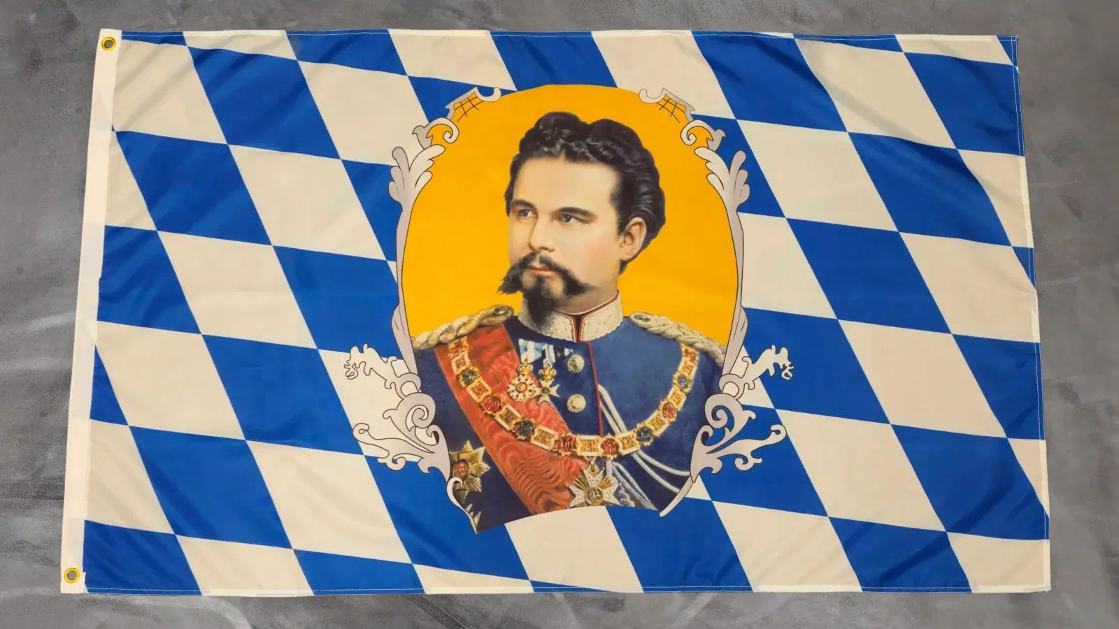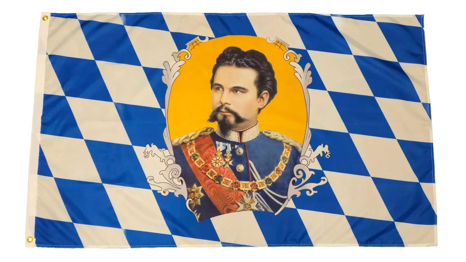 Beschreibung Artikel Details Fahne Flagge Bayern König Ludwig der 2te - 1845 bis 1886 - 90 x 150 cm Unsere Bayern-Fahne im Format 90 x 150 cm würdigt König Ludwig II., einen der bekanntesten Monarchen Bayerns, der von 1845 bis 1886 regierte. Die Fahne zeigt ein Porträt von König Ludwig II. auf einem