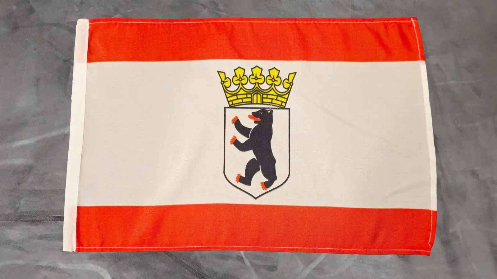 Beschreibung Artikel Details Fahne Flagge Berlin mit Bär - Landesdienstflagge - Stockfahne - 30 x 45 cm Unsere Berliner Landesdienstflagge im Format 30 x 45 cm zeigt das Wappen von Berlin, bestehend aus einem schwarzen Bären mit roter Zunge und Krallen, der in einem weißen Wappenschild mit schwarzer