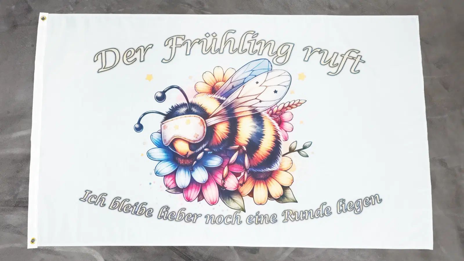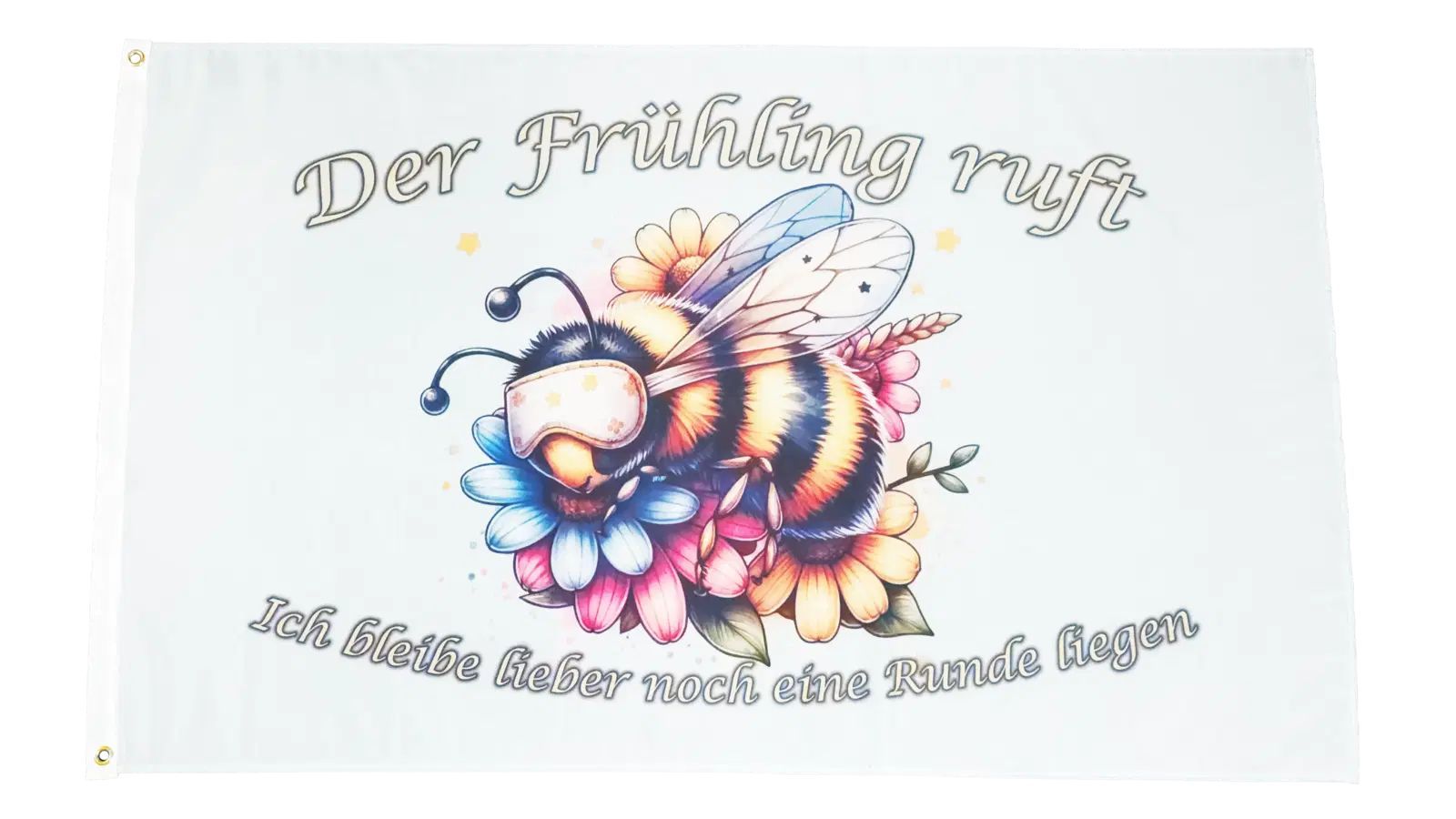 Beschreibung Artikel Details Fahne Flagge Der Frühling ruft Hummel Biene - 90 x 150 cm Die Flagge Der Frühling ruft Hummel Biene mit den Maßen ca. 90 x 150 cm zeigt eine charmante Illustration einer Hummel, die auf bunten Blumen ruht. Der Schriftzug Der Frühling ruft und Ich bleibe lieber noch eine